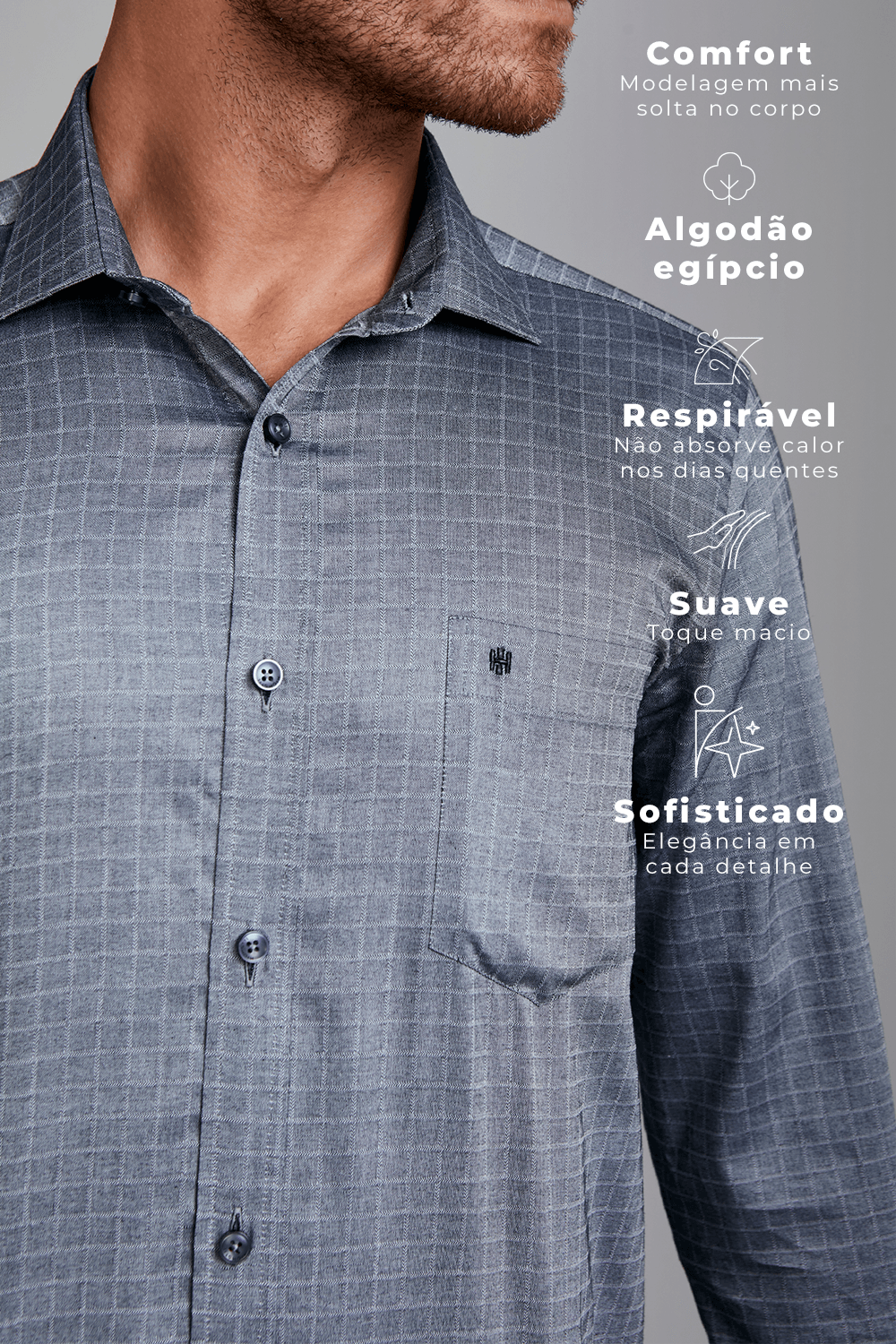 A Camisa com Bolso Comfort é confeccionada em 100% Algodão Egípcio, extremamente suave, respirável e durável, com acabamento sofisticado. A peça conta com colarinho Milano.