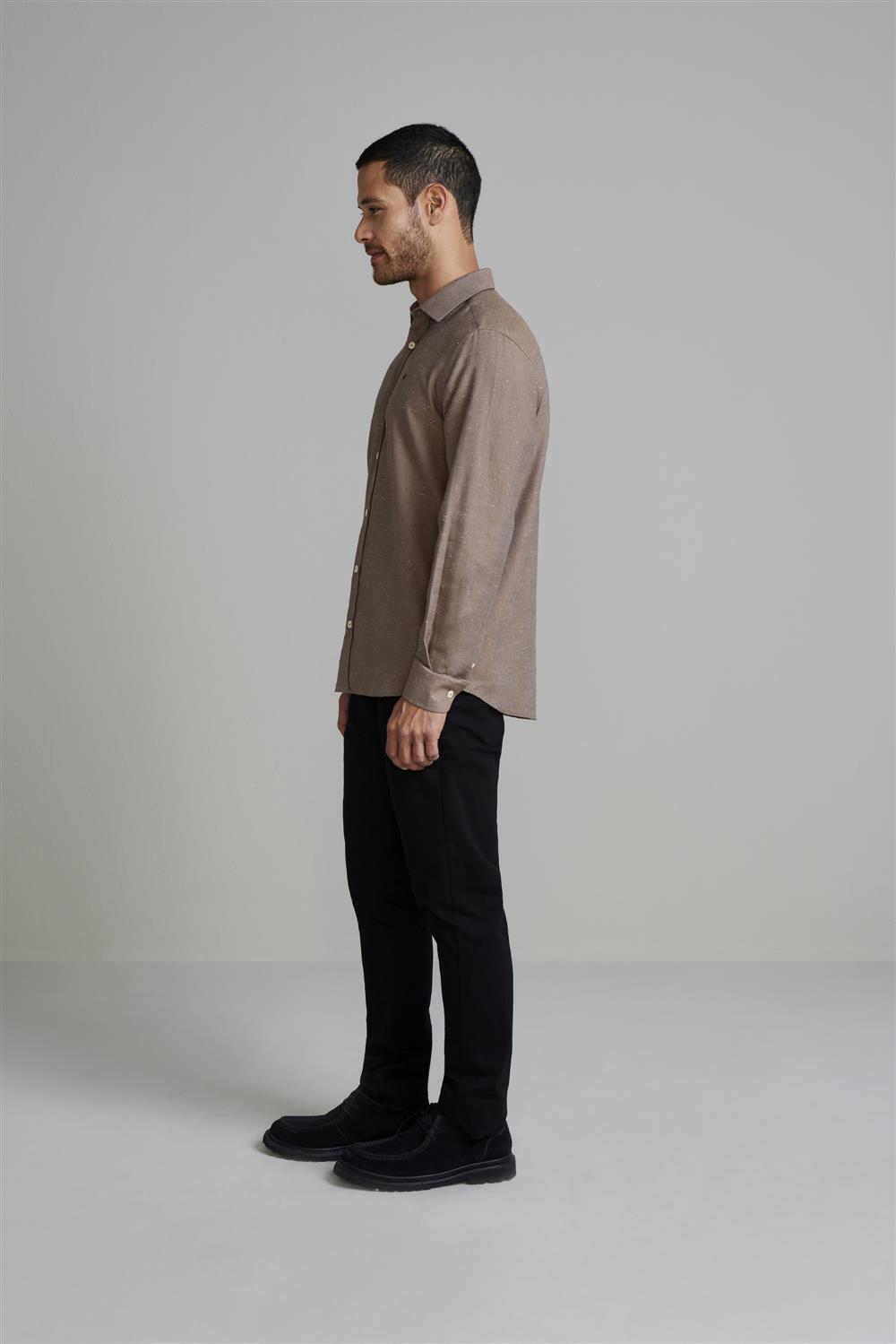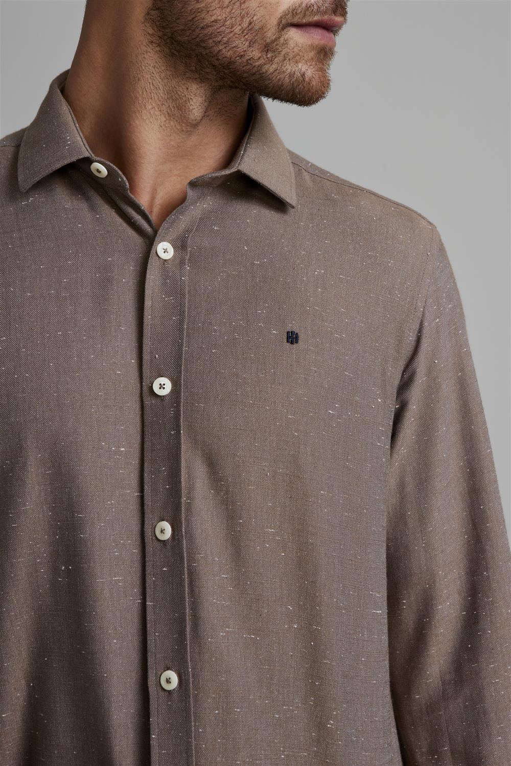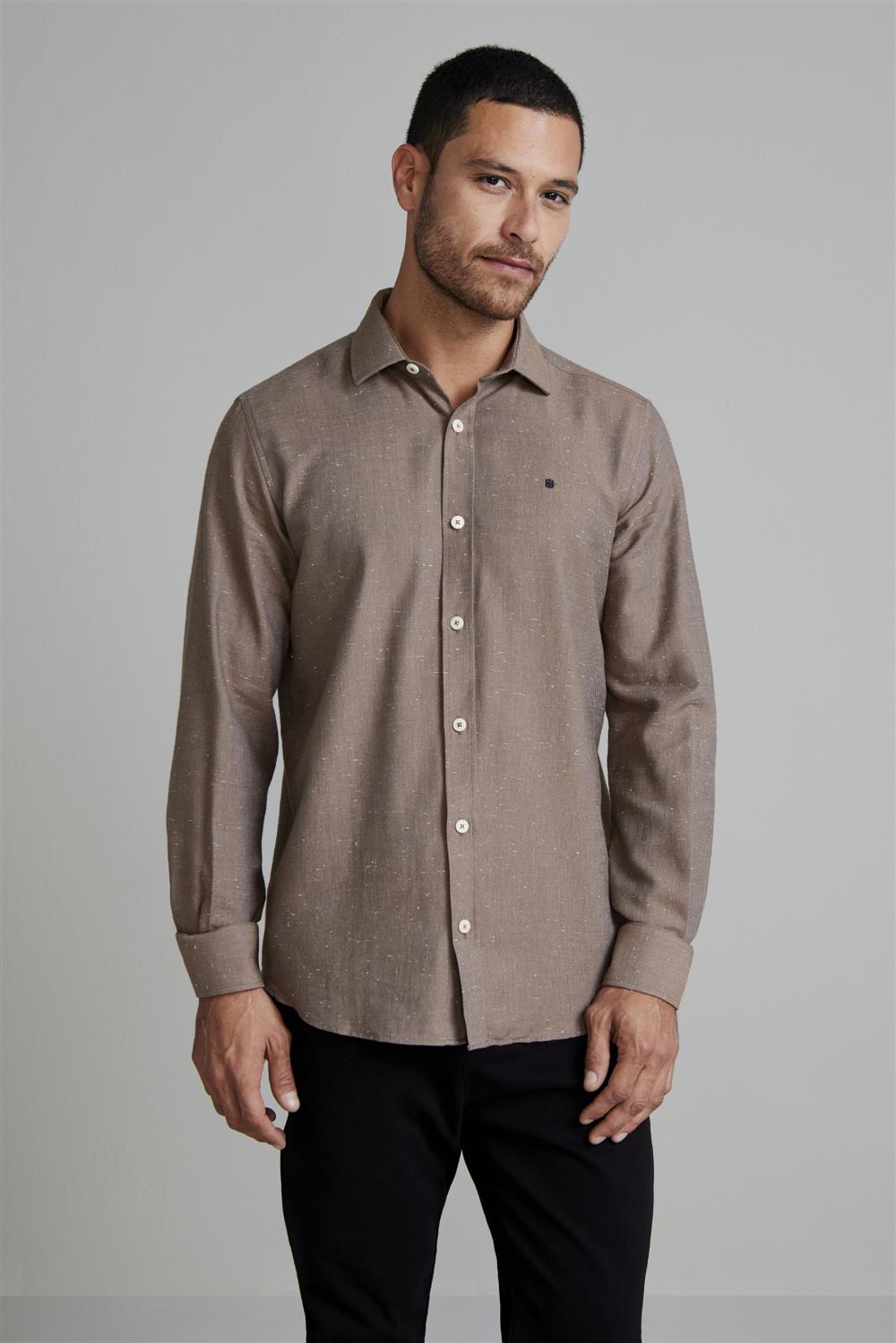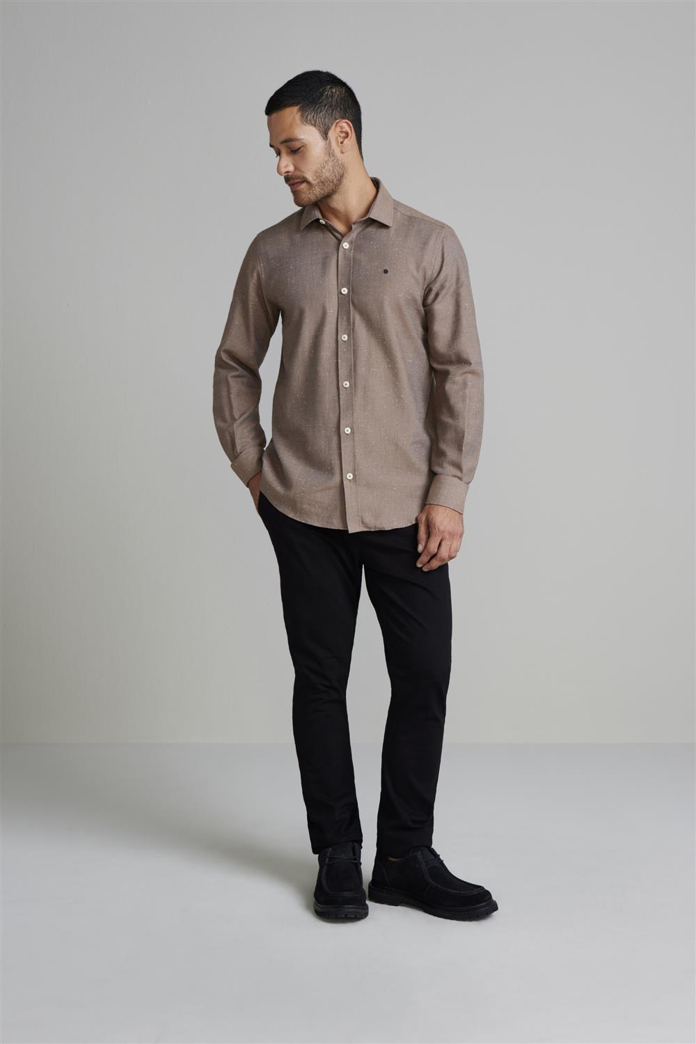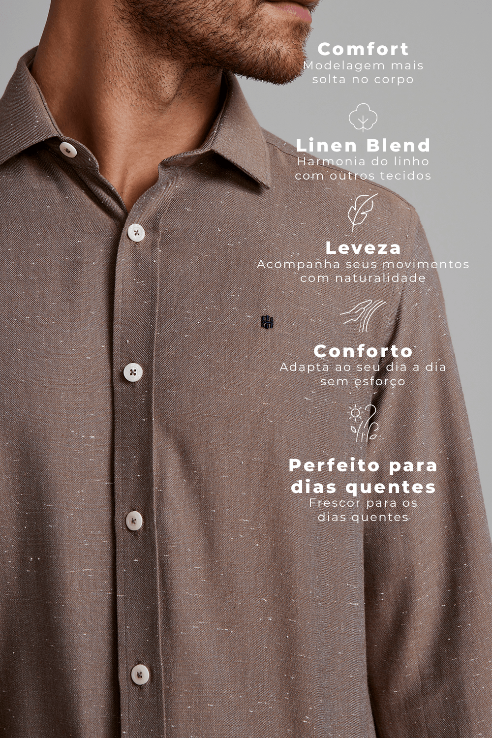 A Camisa Linen Blend Comfort é confeccionada em 51% Algodão, 35% Viscose, 16% Modal e 3% Linho, oferece leveza, frescor e conforto, ideal para climas quentes. A peça conta com colarinho Londres.