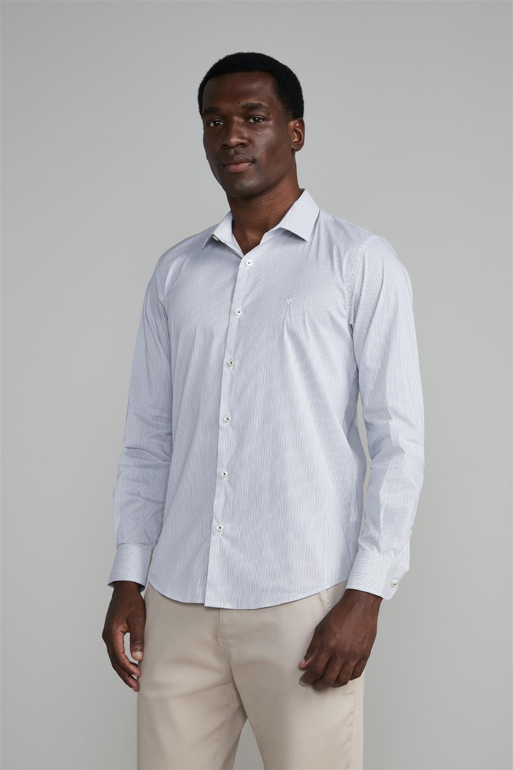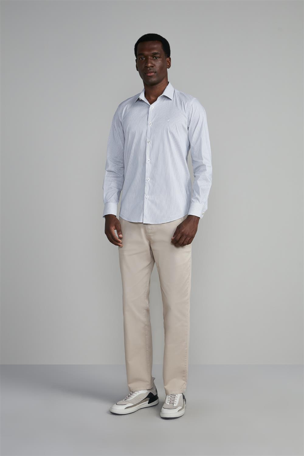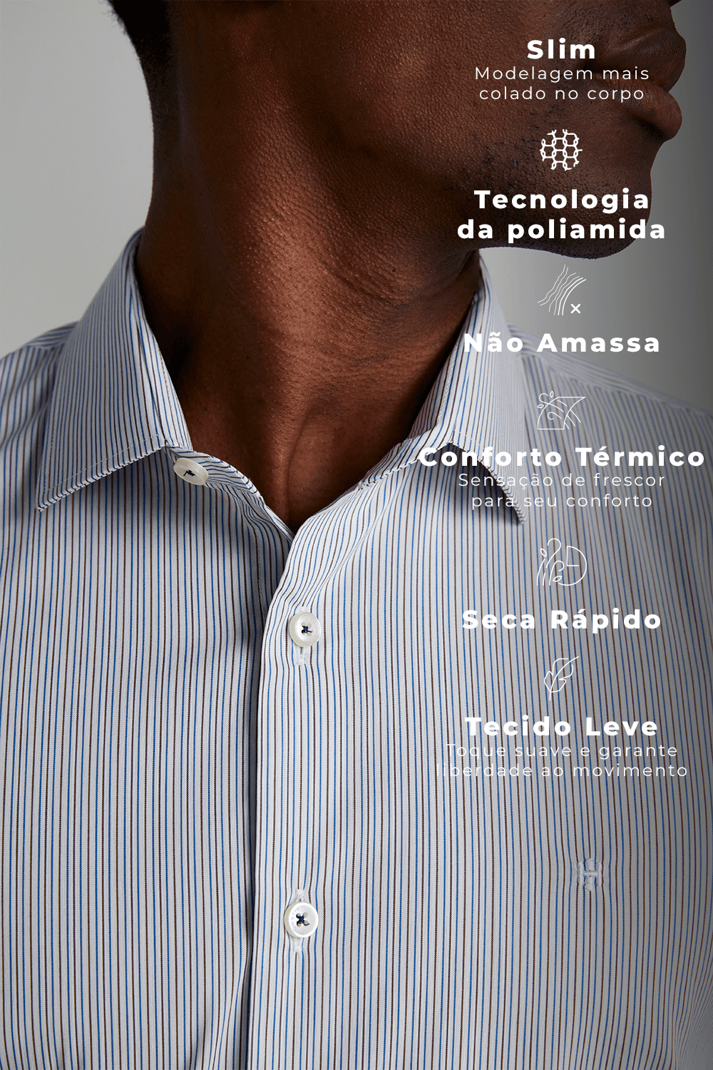 A Camisa Slim Fit é confeccionada em 70% Algodão, 27% Poliamida e 3% Elastano. A peça conta com colarinho Milano.