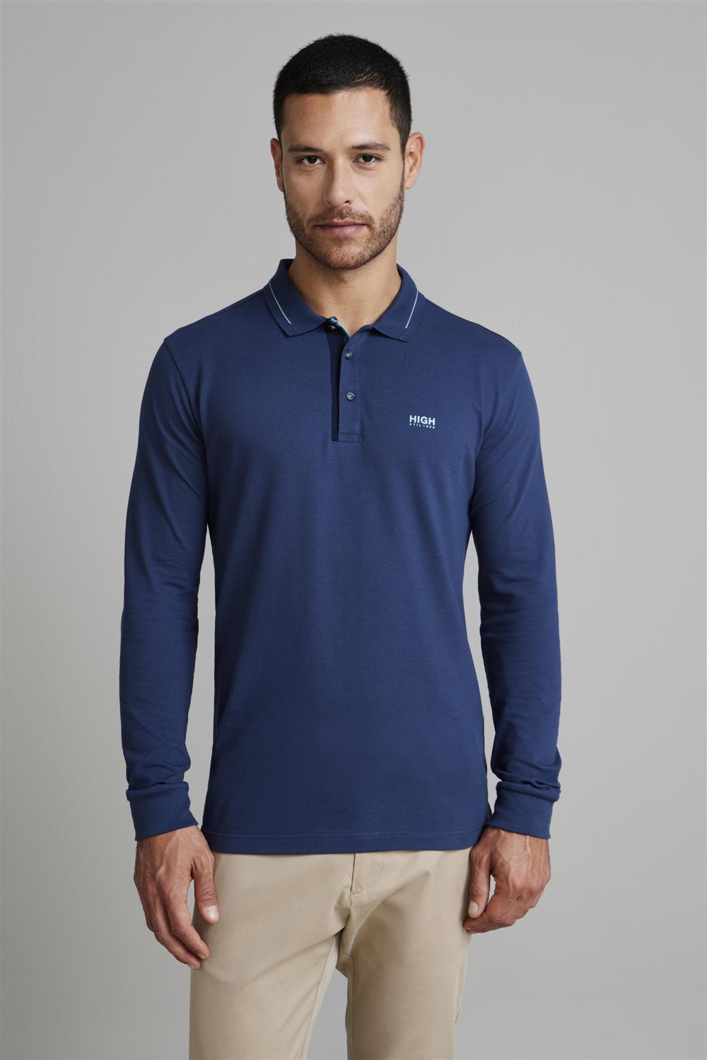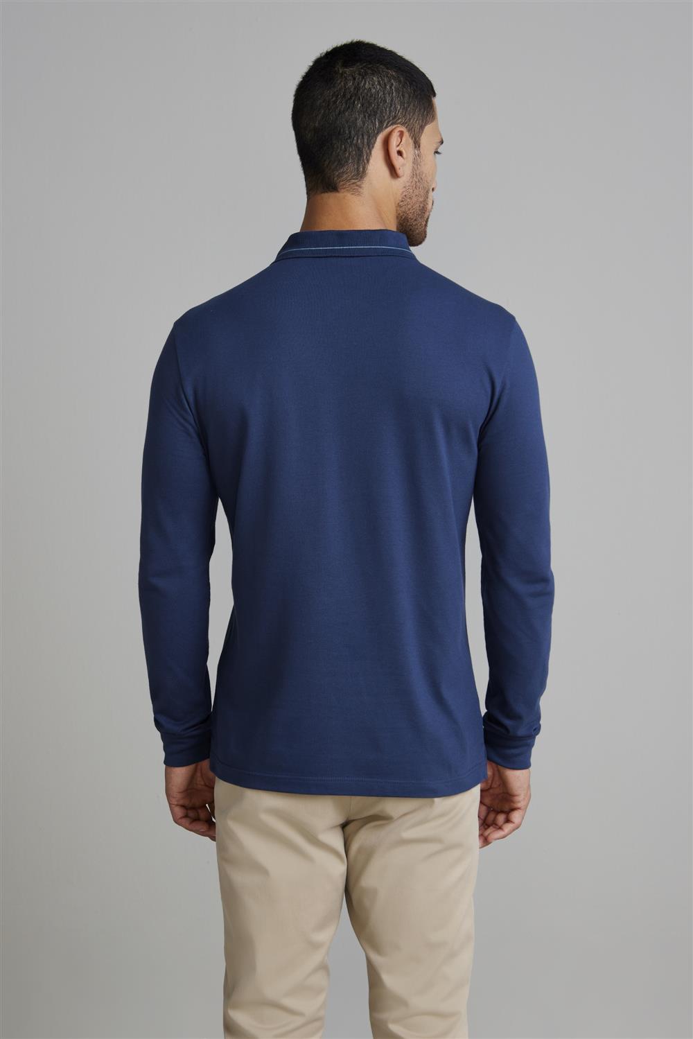 Camisa Polo Manga Longa Piquet Slim Fit - Azul Petróleo