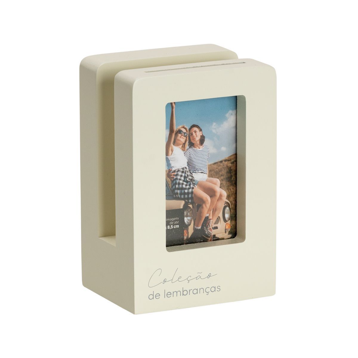 Todo em MDF na cor off-white, essa lindeza comporta 1 foto de até 8,5 cm x 5,4 cm e traz também um espaço para você enfileirar outras fotografias (com as mesmas dimensões). Assim, você consegue ter suas fotos favoritas organizadas no mesmo lugar.