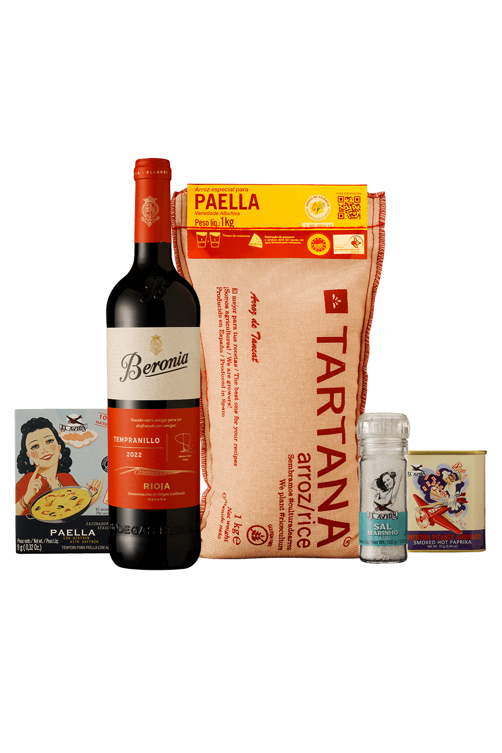 Para acompanhar, o Vinho Beronia Tempranillo oferece notas de frutas vermelhas maduras e leve toque amadeirado, criando uma harmonização perfeita com a riqueza da paella.