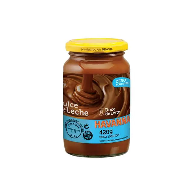 Pote Doce de Leite Zero 420g - Havanna *Receita Argentina, feito no Brasil.* A história da Havanna começou a ser escrita em 1948. Sinônimo de tradição e qualidade artesanal, transformou-se em um dos maiores ícones da Argentina! Eleito o melhor Doce de Leite do mundo, o Dulce de Leche Havanna é um símbolo de prazer. Possui alta cremosidade, um aroma perfumado de baunilha e um sabor irresistível. Agora em uma versão sem adição de açúcares, sem perder sua cremosidade e sabor único. Uma verdadeira explosão de sabores para seu momento Dulce. Ingredientes: Leite integral reconstituído, edulcorantes: maltitol e sorbitol, espessante: gelatina (INS 428), conservador: sorbato de potássio (INS 202) e aromatizante sintético idêntico ao natural de baunilha. ALÉRGICOS: CONTÉM DERIVADOS DE LEITE. PODE CONTER DERIVADOS DE SOJA; CONTÉM LACTOSE. NÃO CONTÉM GLÚTEN