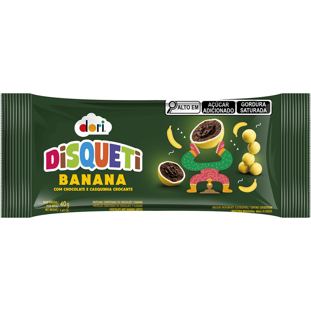 Disqueti Banana 40g - Dori Não existe nada mais contagiante e gostoso que provar algo surpreendente. Disqueti é para você que quer fugir das escolhas comuns. E que deseja se libertar daqueles chocolates batidos que todo mundo conhece. Somos diferentes porque acreditamos que os apaixonados por chocolates não são todos iguais. Levamos até as pessoas sabores e novidades que vão além do comum, despertando aquela sensação única de provar algo novo e simplesmente irresistível. Tudo isso com um toque prático para você levar na mochila, na bolsa ou ter sempre na mesa do escritório.