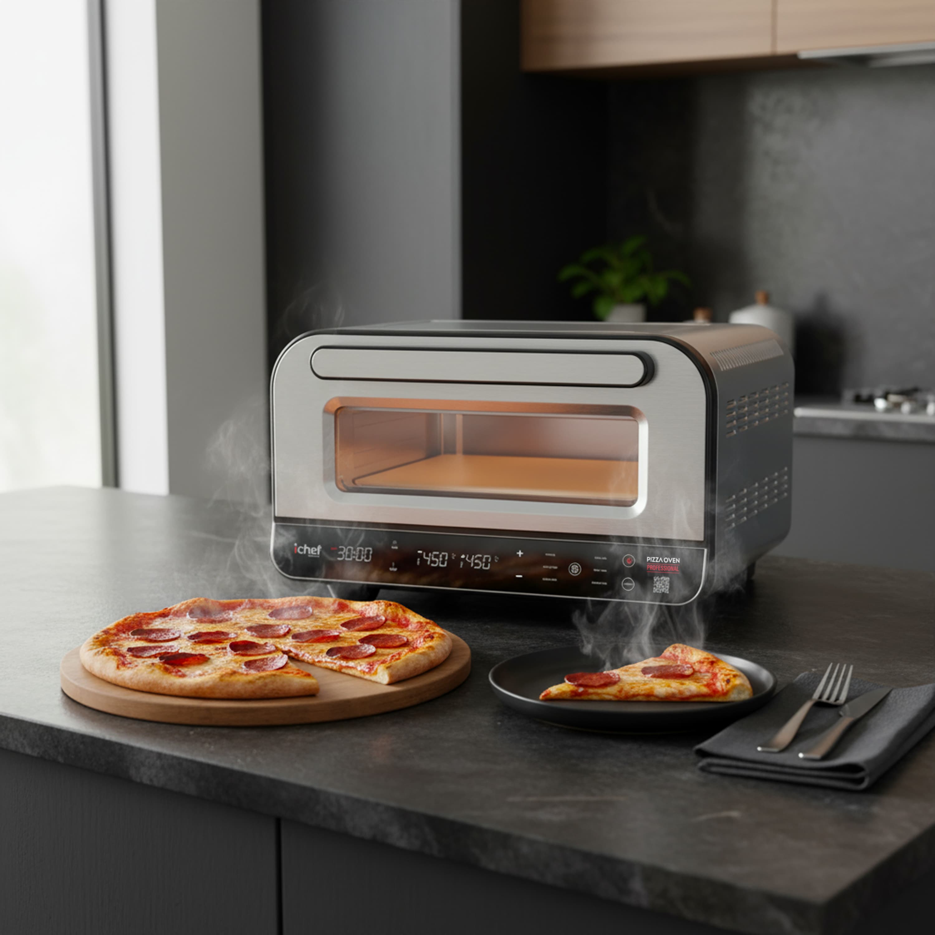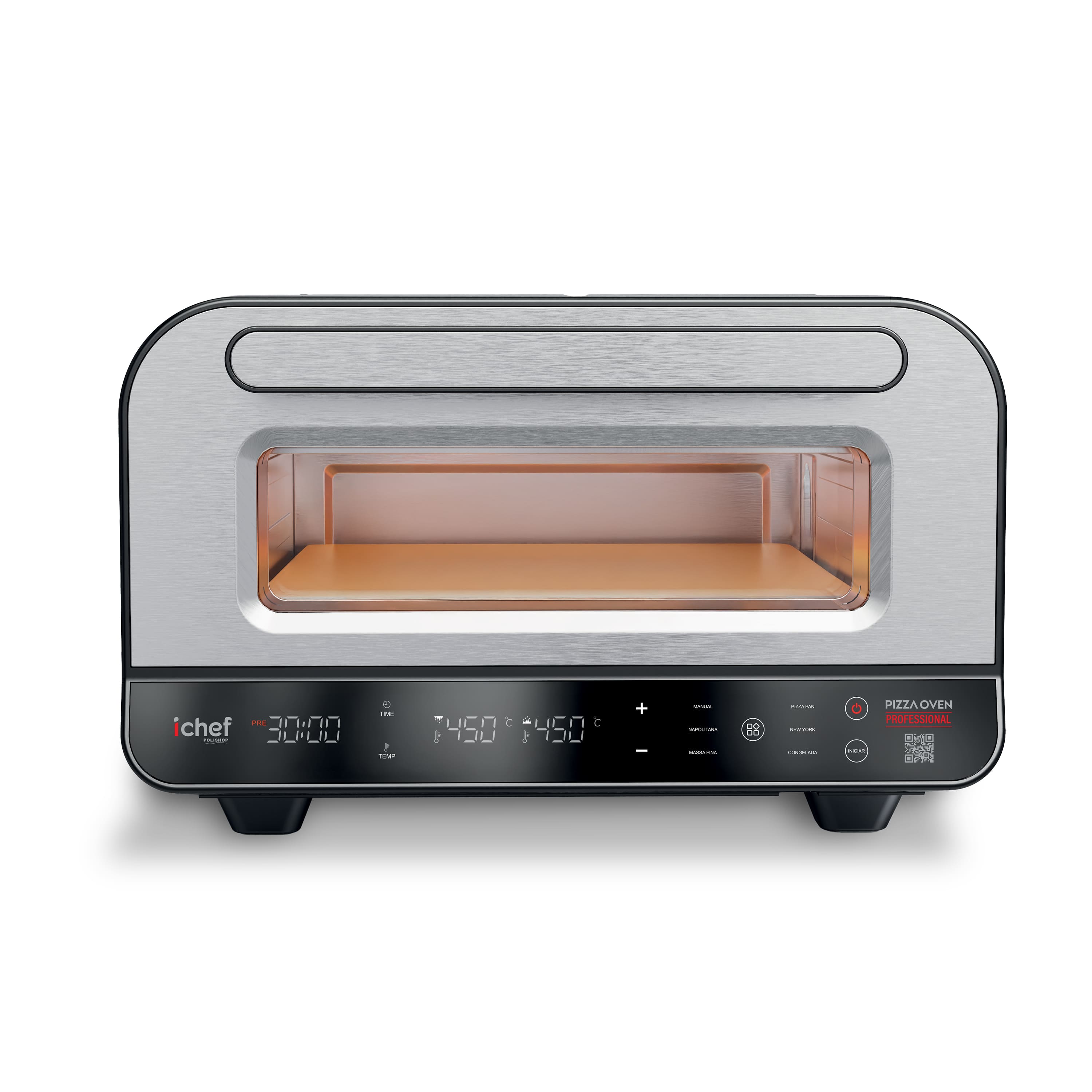 Sinta o sabor de uma pizzaria profissional direto na sua casa! Com ichef Pizza Oven Professional você tem resultado perfeito, em cada preparo! Ele alcança incríveis 450°C e entrega pizzas com massa aerada, bordas crocantes e recheio derretendo. Com controle total de temperatura, funções automáticas e design compacto, ele transforma qualquer cozinha em uma verdadeira estação gourmet.