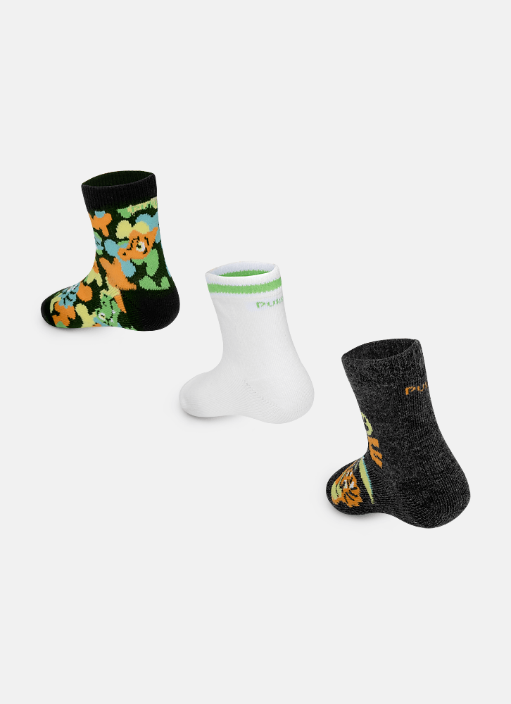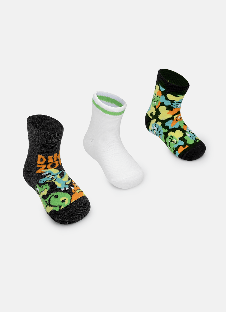 Kit com três pares de meias em algodão macio, sendo duas com desenhos divertidos e uma em cor lisa com detalhe no punho. Possuem cano confortável de altura média. Indicação de uso: Ideal para ser usada com tênis e sapatos. Instruções de Lavagem: Lavagem a mão Não alvejar Instruções de Conservação: Não secar em tambor Não passar Não limpar a seco (MAIS INFORMAÇÕES, VIDE NA ETIQUETA) Instruções de Garantia: Deverá ser encaminhado dentro na embalagem original ACOMPANHADO DE NOTA FISCAL E com todos os itens constante na solicitação da compra.