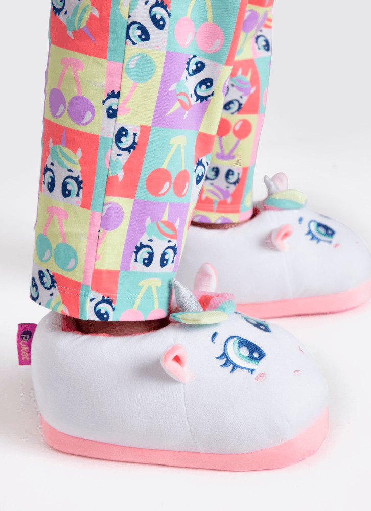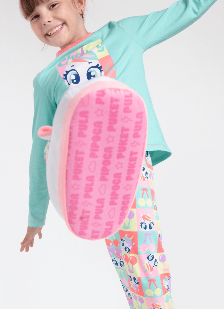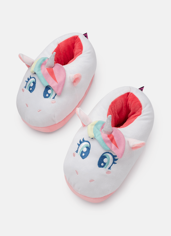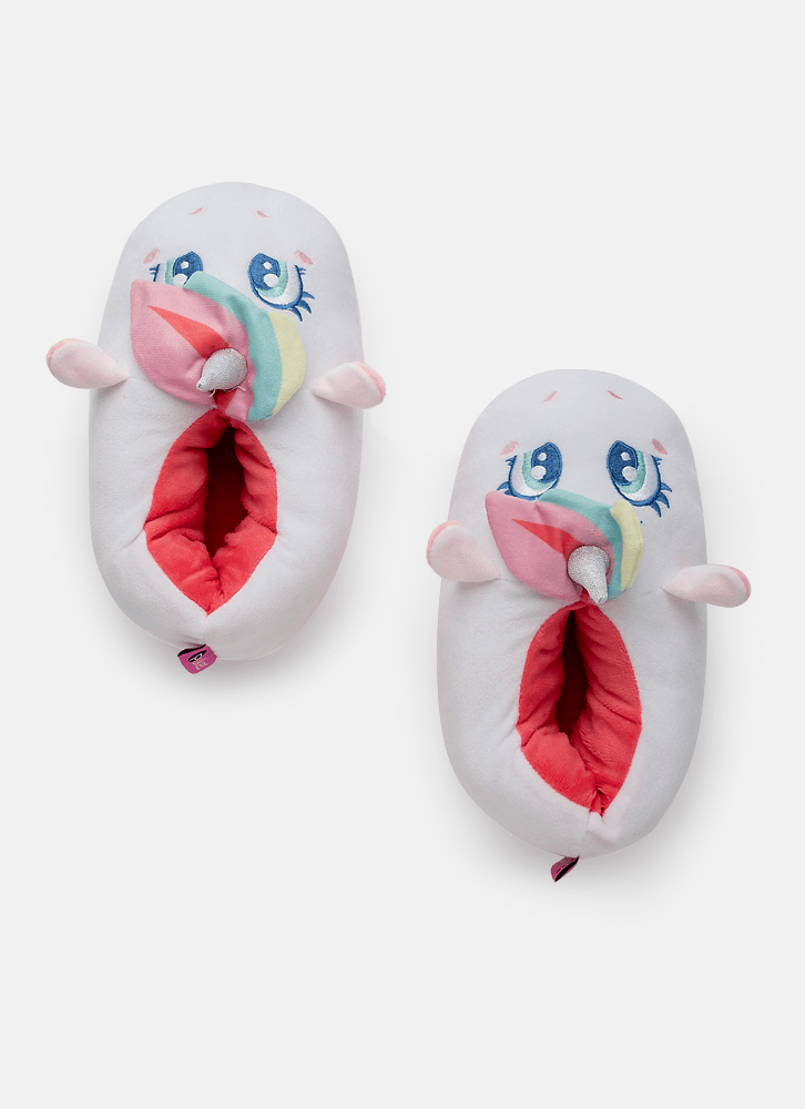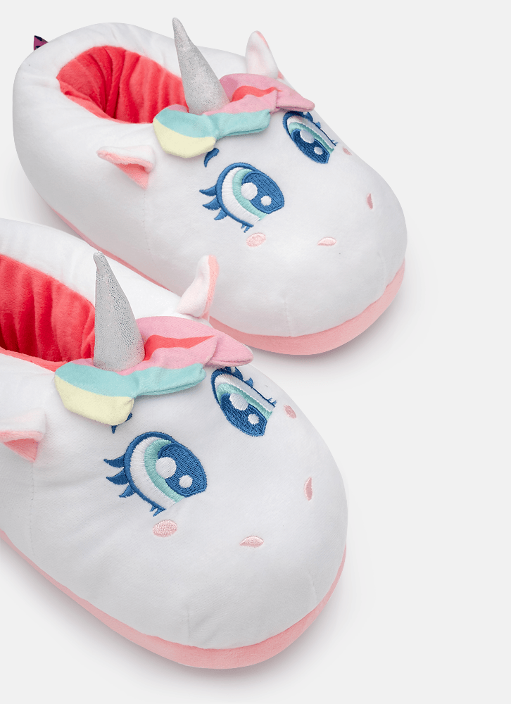 Pantufa infantil em pelúcia. Formato 3D de unicórnio com rosto bordado, aplique de cabelo, orelhinhas e chifres. Solado macio e confortável e forro em tecido macio. Cor: Branco Indicado para: Crianças / adolescentes Ocasião: ambientes internos Material externo/interno: Poliéster (pelúcia) Peso do produto: 0,190 Limpeza e conservação: Para limpeza, não lavar com escova abrasiva; lavar à mão com sabão neutro e água corrente; lavar separadamente as cores fortes das claras; não utilizar produtos abrasivos como cloro e água sanitária; não deixar a peça de molho; secar à sombra; não passar o ferro. Garantia: Deverá ser encaminhado dentro da embalagem original, sem indicações de uso, acompanhado de nota fiscal e com todos os itens constante na solicitação da compra. Indicado para crianças à partir de 3 anos.