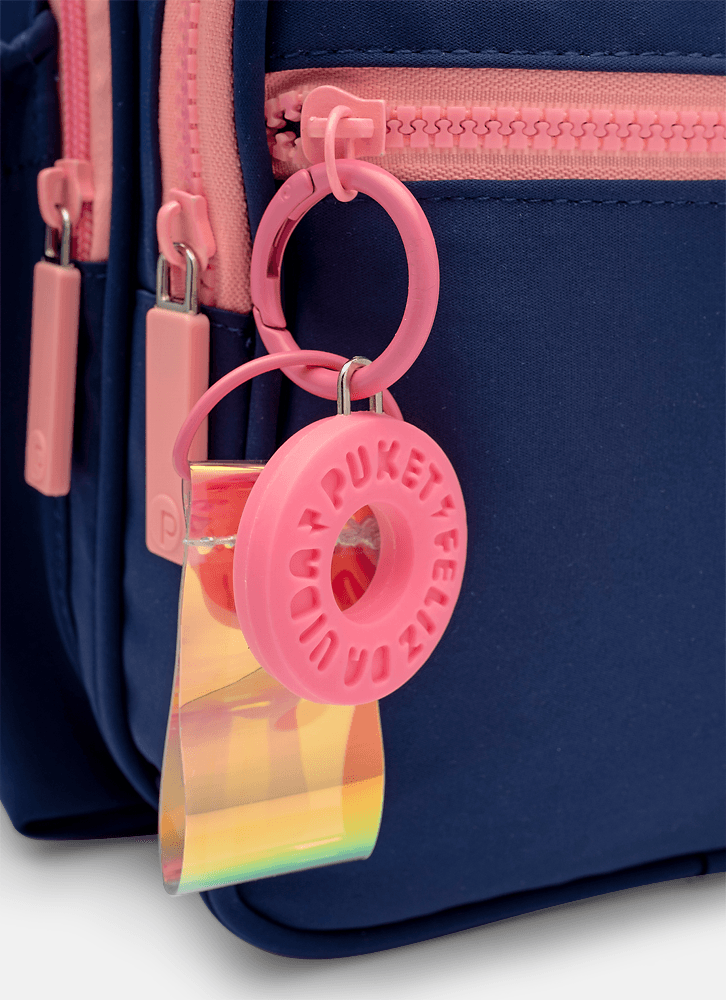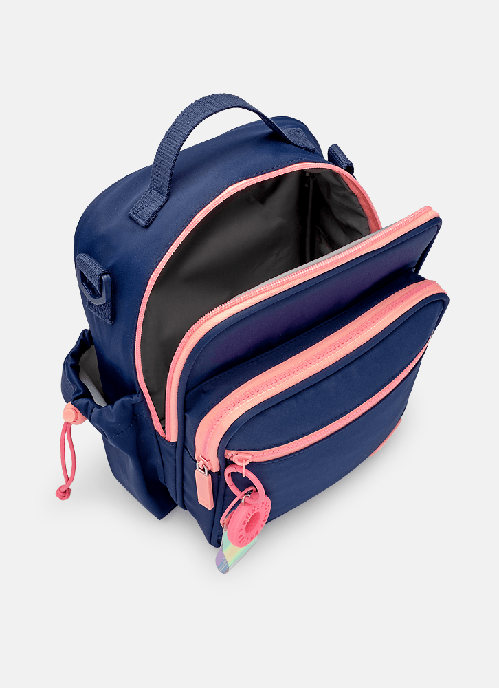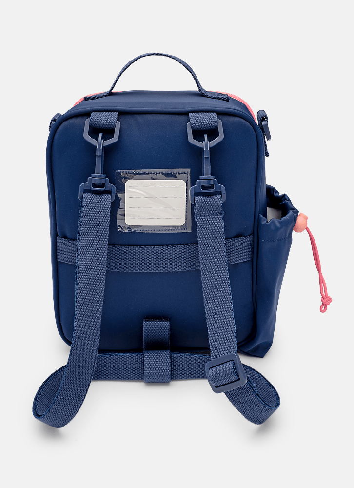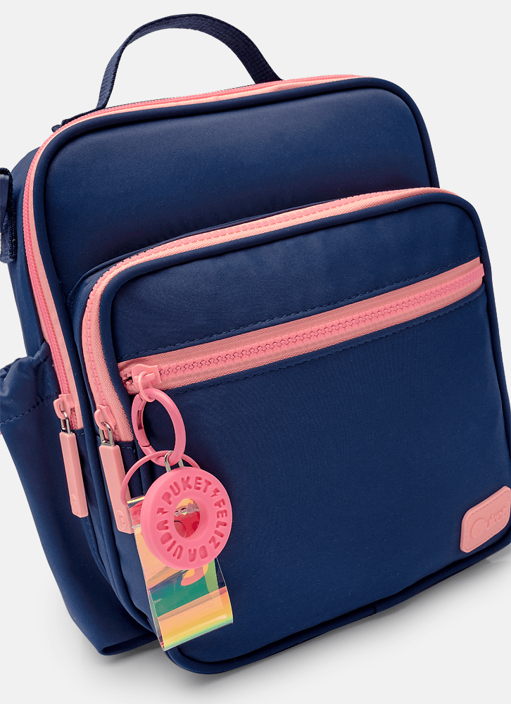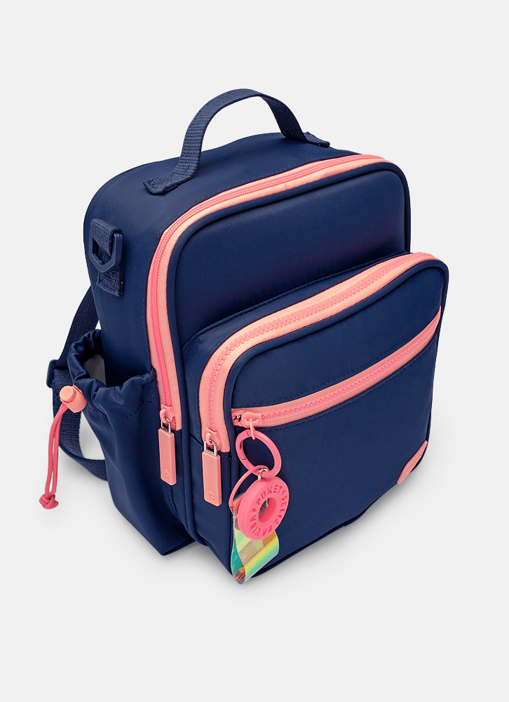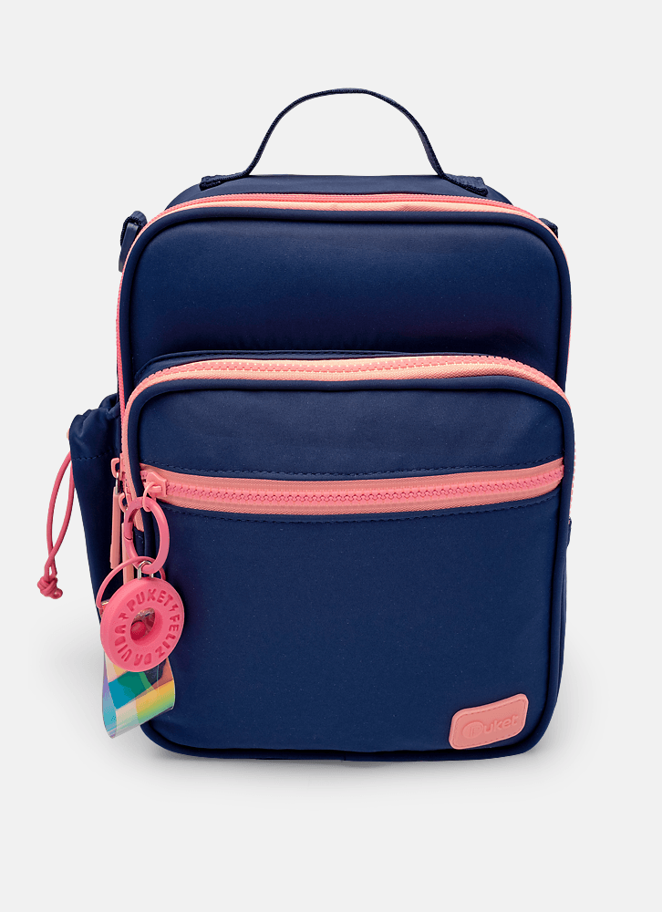 Lancheira em nylon na cor marinho com forro térmico. Possui 2 bolsos frontais além do bolso principal e um bolsinho lateral para garrafinha. Alça de mão fixa e alça de ombro com regulagem. Acompanha chaveiro diferenciado no bolso posterior.