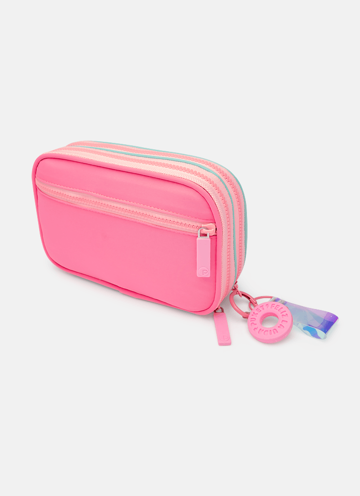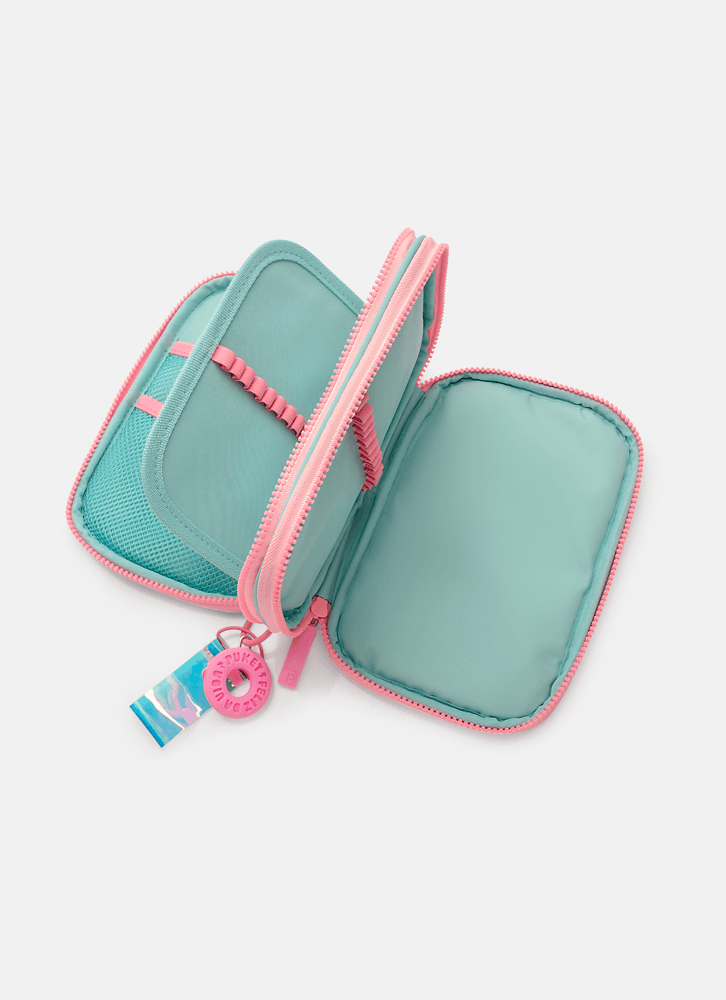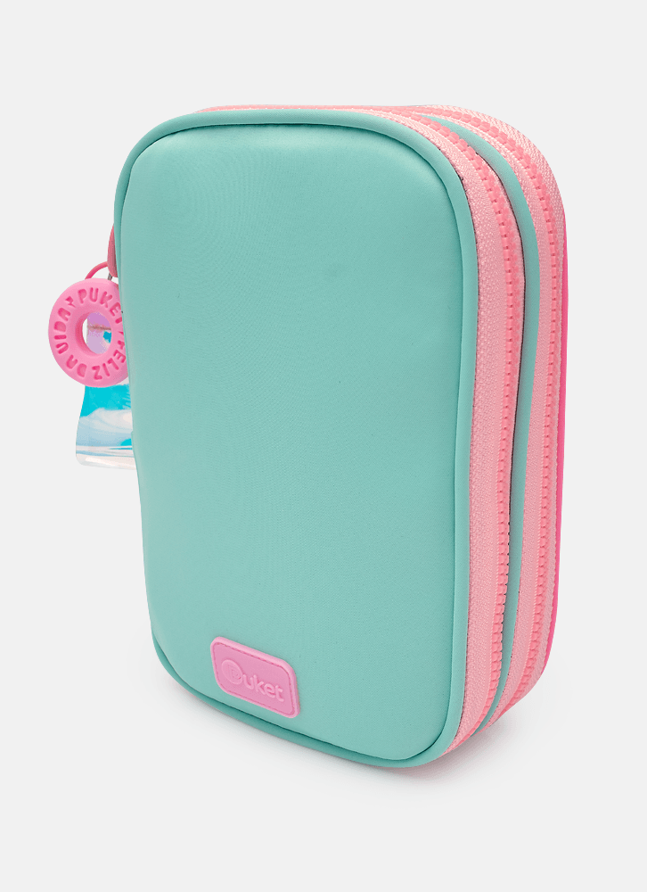 Estojo grande em nylon na cor verde água. Possui dois compartimentos com fechamento por zíper, aba interna com 24 elásticos para armazenamento de lápis. Parte posterior com bolso. Acompanha chaveiro diferenciado no bolso posterior