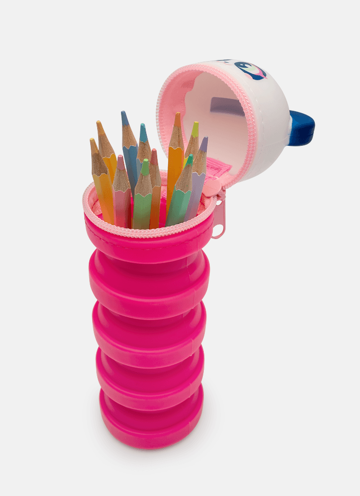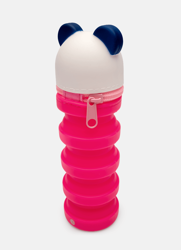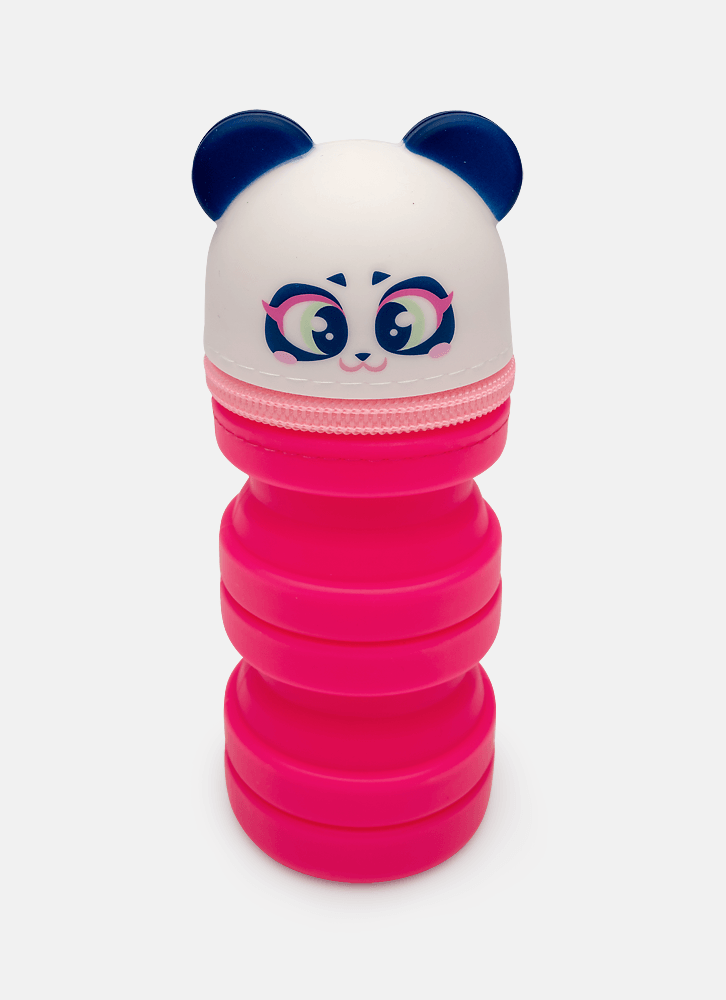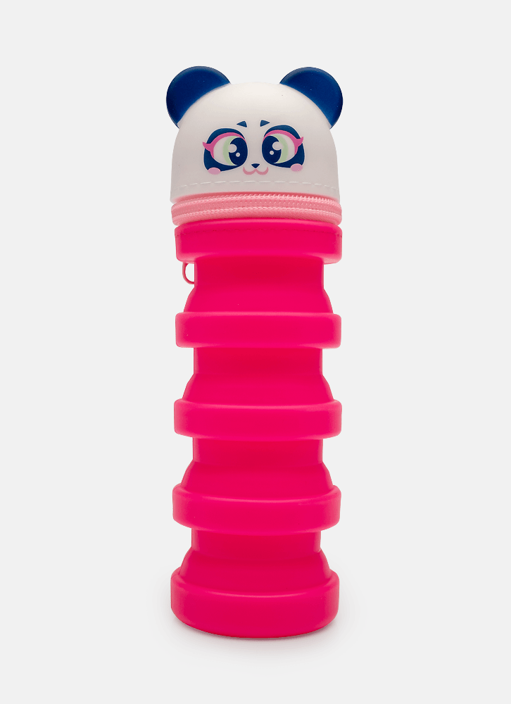 Estojo pequeno em silicone. Possui formato retrátil (menor quando vazio), fechamento por zíper, aplique e estampa de Panda.