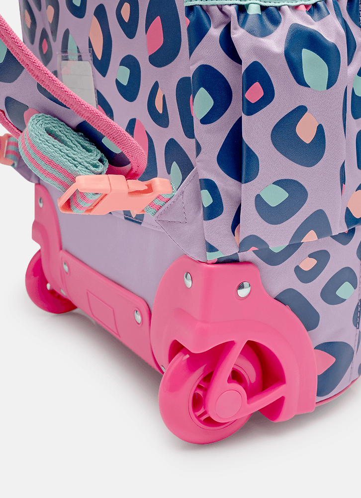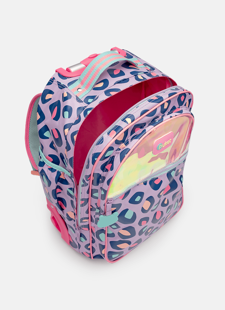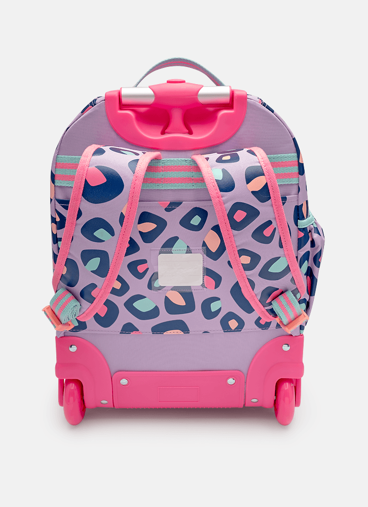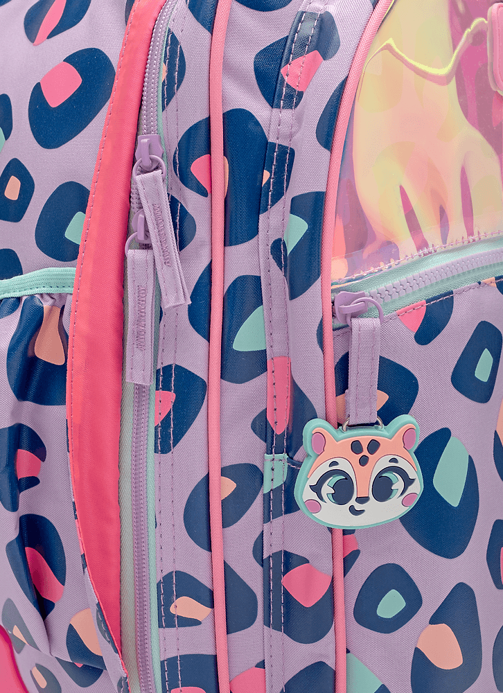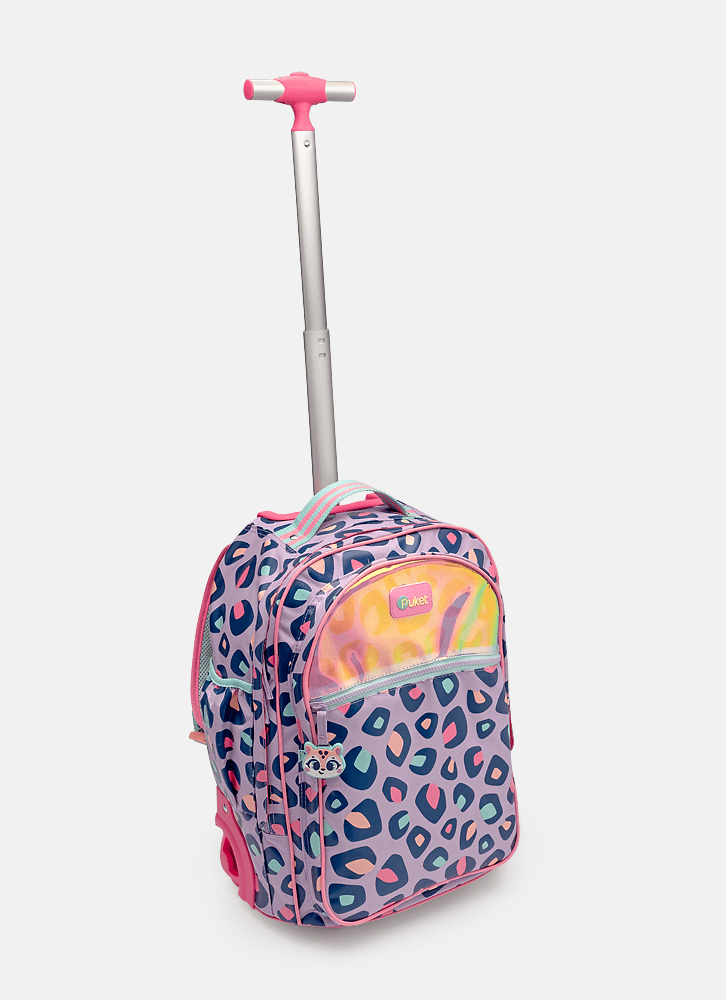 Mochila de rodas em nylon com rodinha de Onça. Bolso frontal em TPU holográfico, puxador do zíper emborrachado, bolsinho lateral para garrafinha, alça de mão e puxador com duas alturas de regulagem.