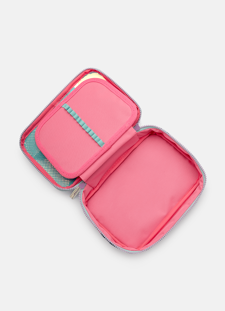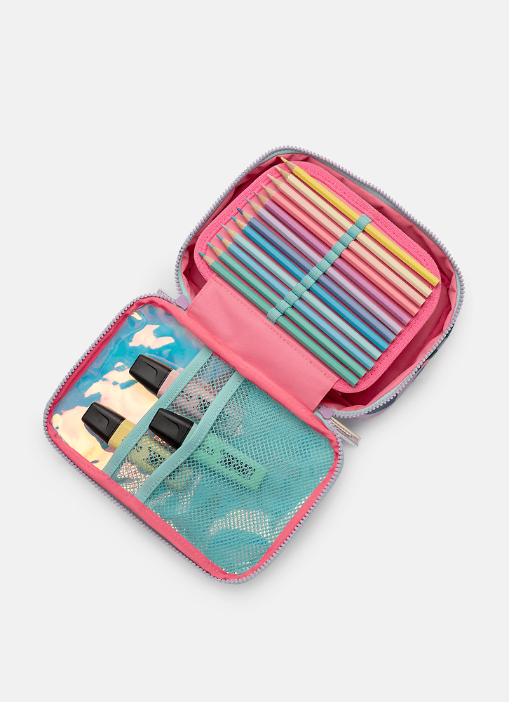 Estojo grande em nylon. Parte frontal em TPU holográfico com estampa localizada de onça.Possui aba interna com 24 elásticos para armazenamento de lápis e 2 bolsinhos internos em telinha.