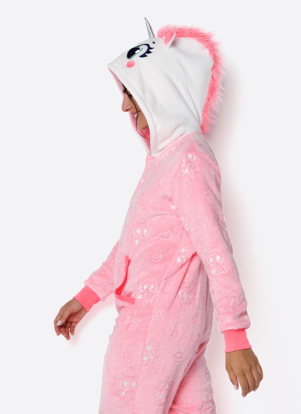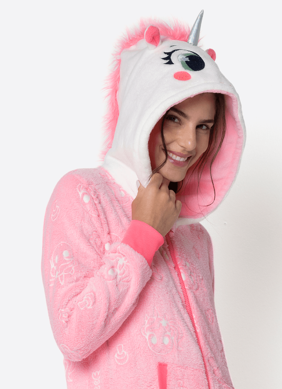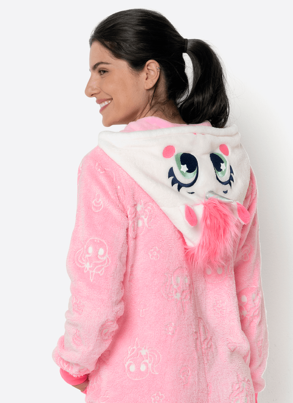 Macacão em coral fleece com estampa do unicórnio encantado.