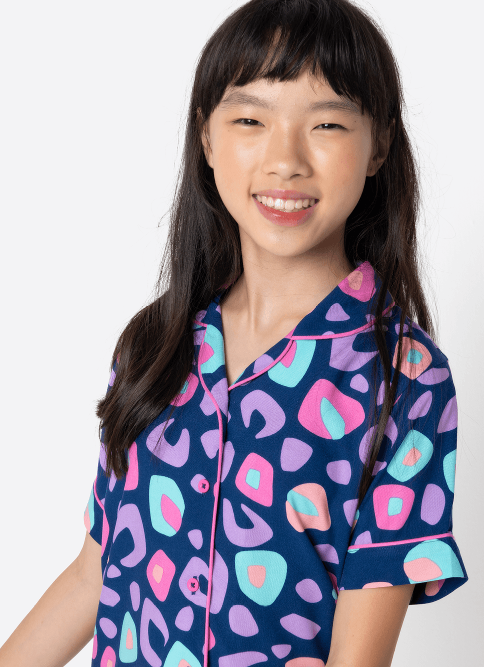 Conjunto composto por camisa de mangas curtas + short com acabamento em cores contrastantes. Tecido leve e de ótimo caimento para dias e noites mais confortáveis.