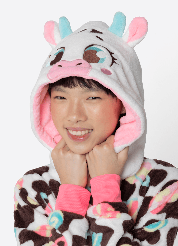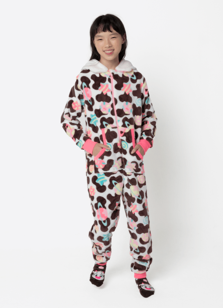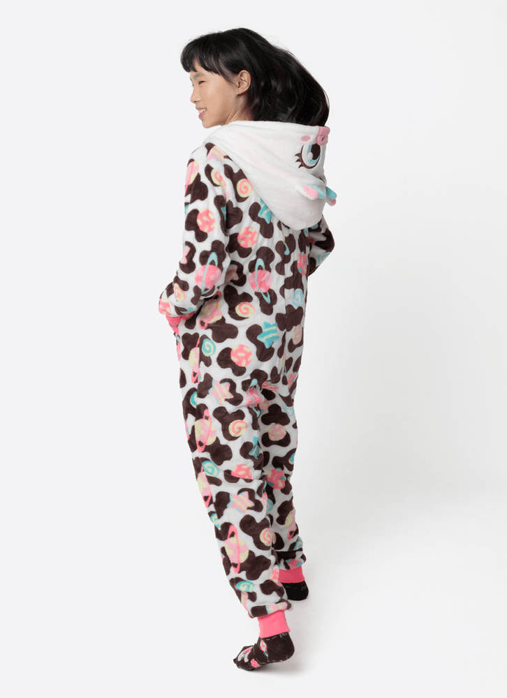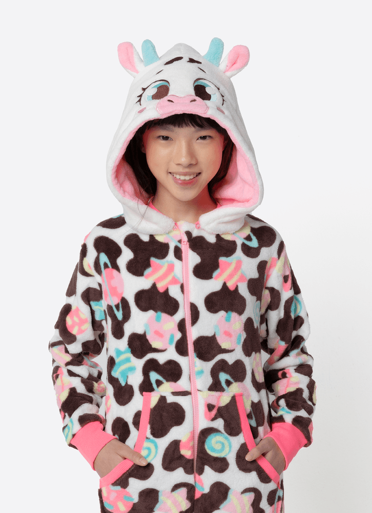 Macacão em coral fleece com estampa de vaquinha Puket.