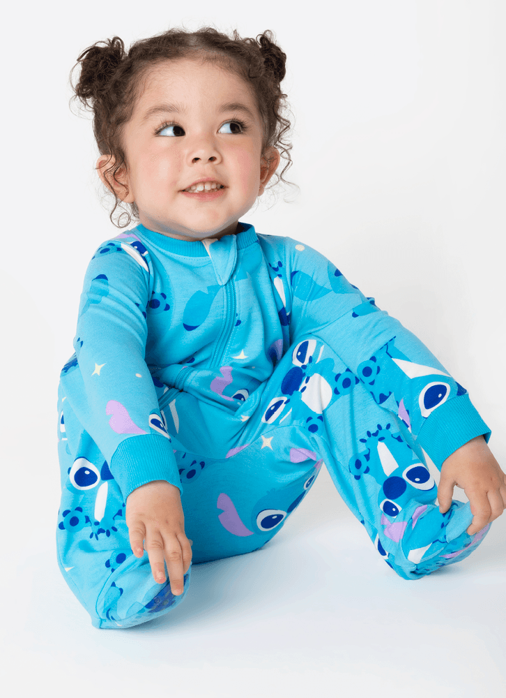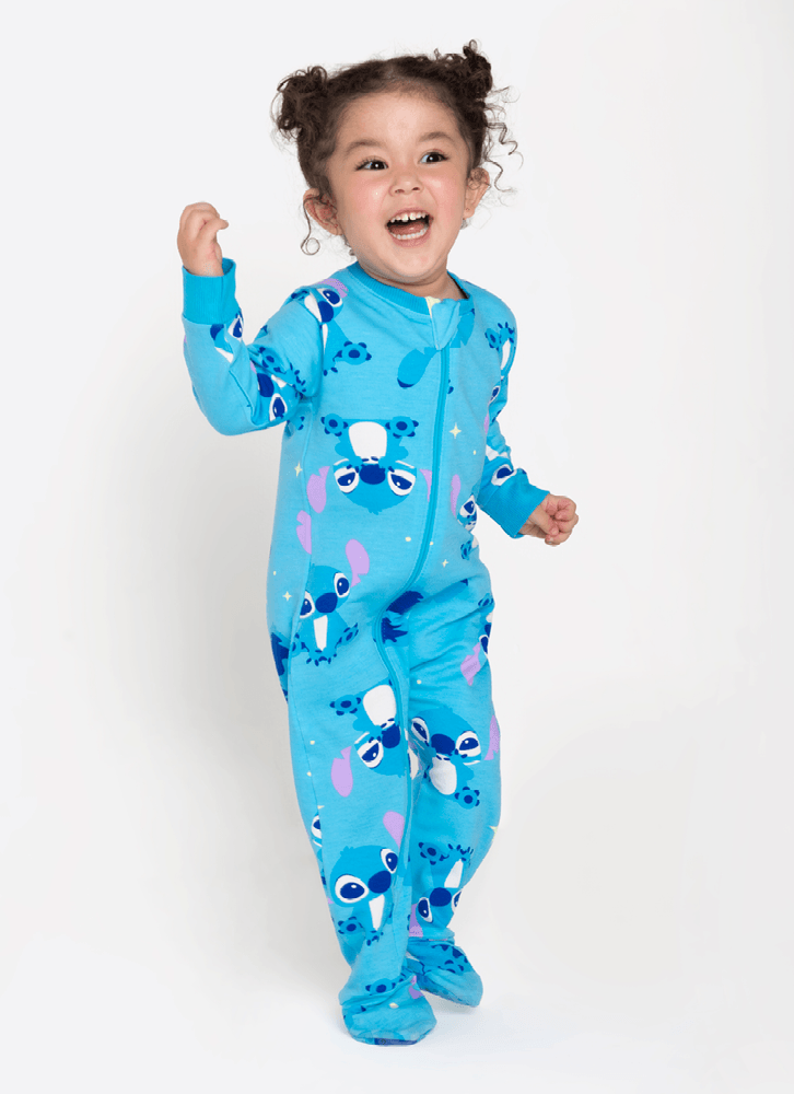 Macacão todo em estampa corrida no tema Stitch e fecho frontal em zíper;