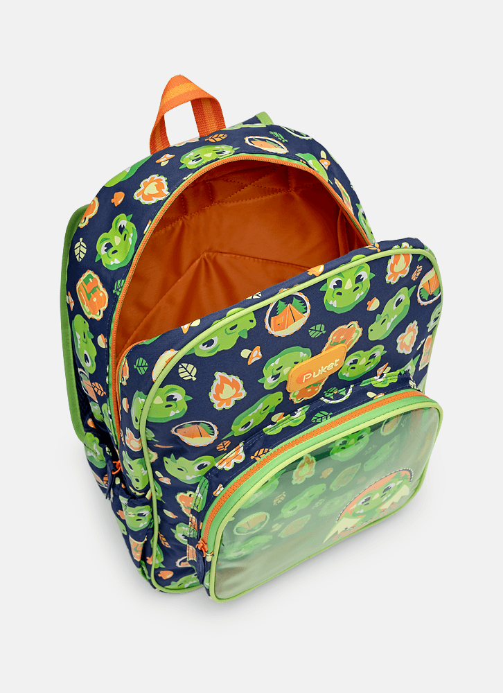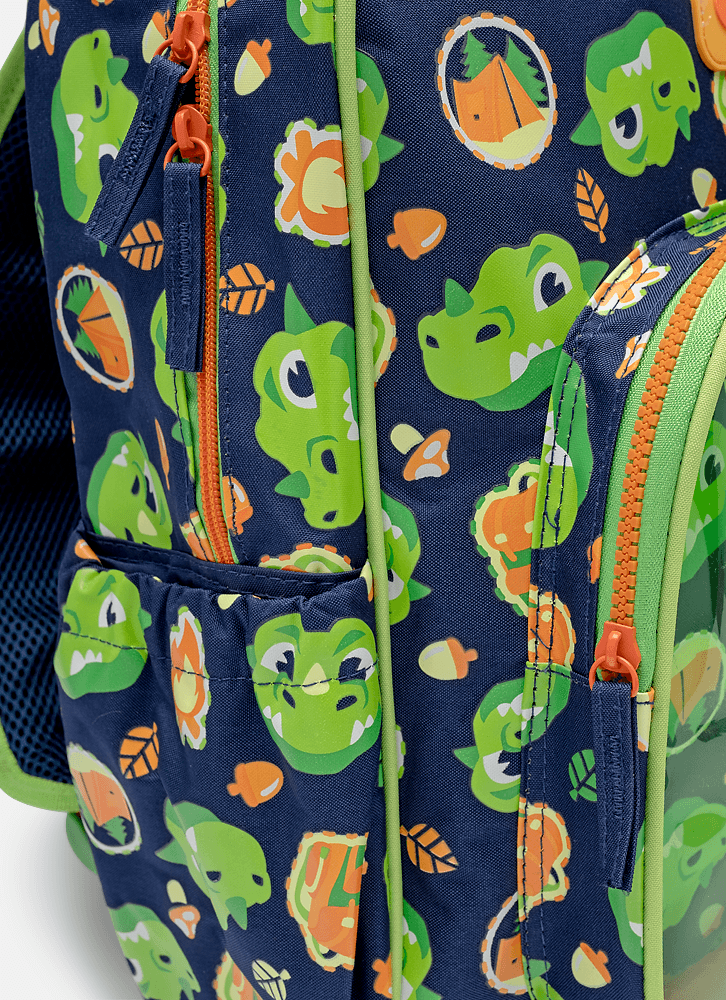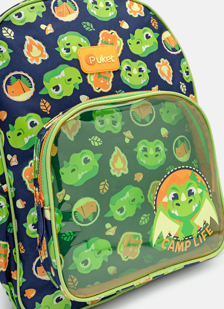 Mochila grande em nylon com bolso frontal em PVC Transparente com estampa de Dragão. Possui fechamento por zíper e bolsinho lateral para garrafinha.