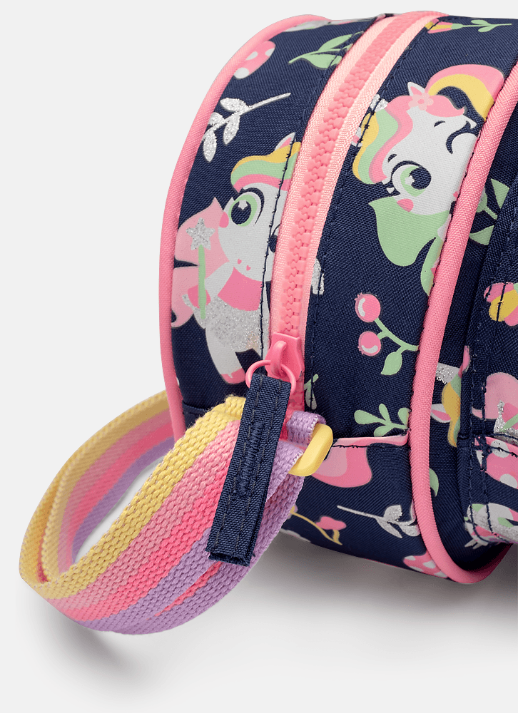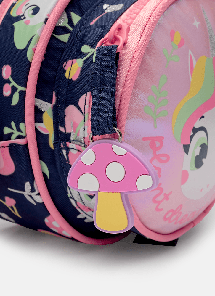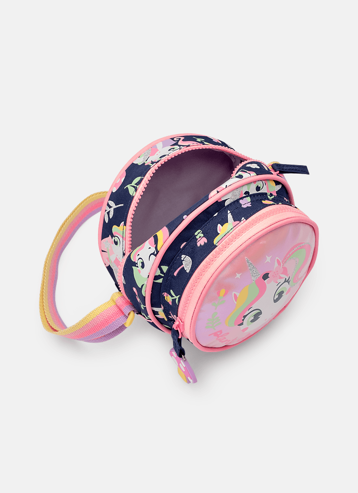 Bolsinha com bolso frontal de Unicórnio Encantado em PU holográfico com estampa localizada. Possui alça regulável.