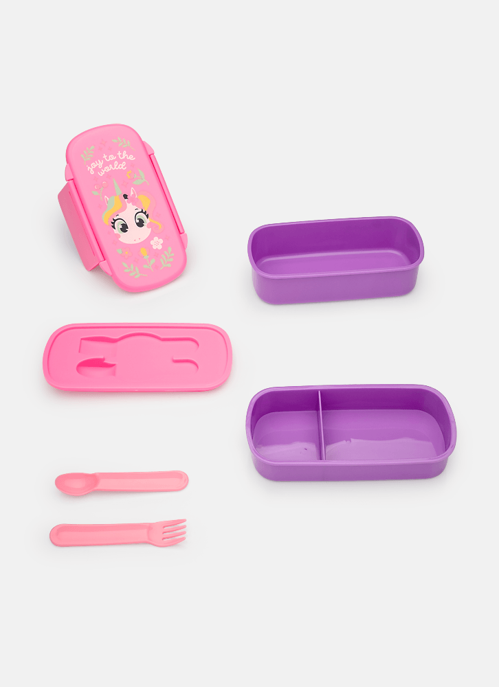Marmita média em formato retangular de borda arredondada com dois compartimentos, tampa de encaixe com estampa de Unicórnio Encantado. Acompanha 1 garfo e 1 colher de plástico.
