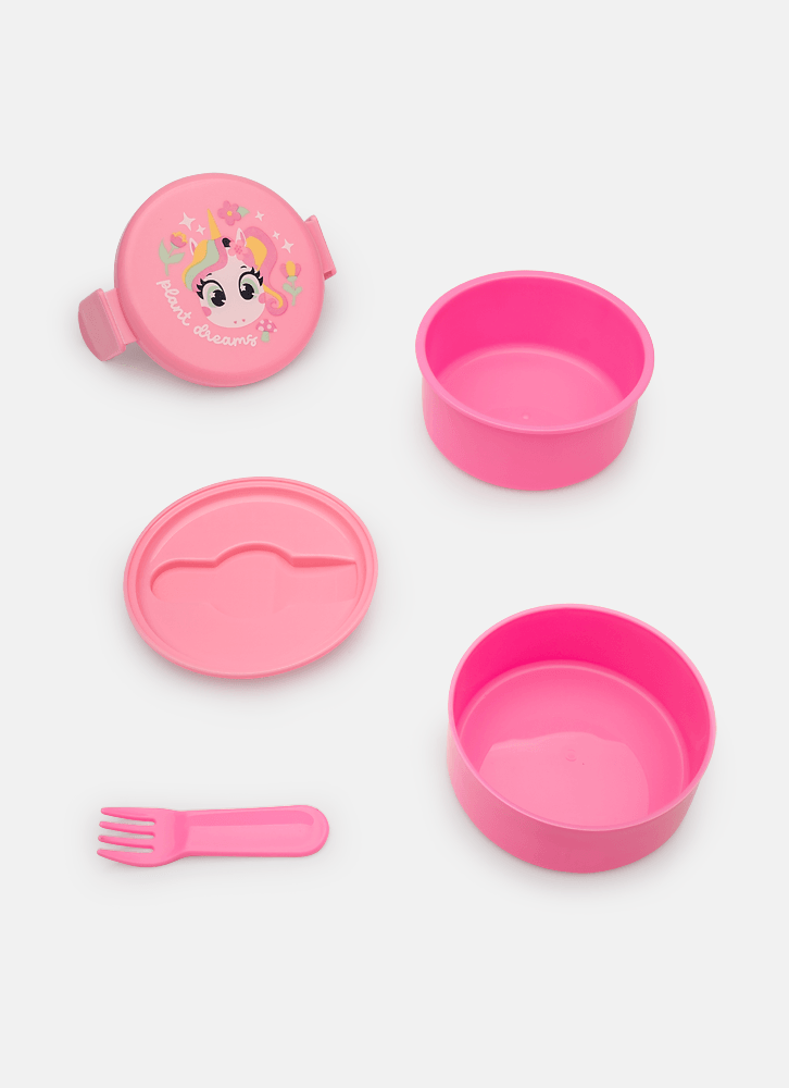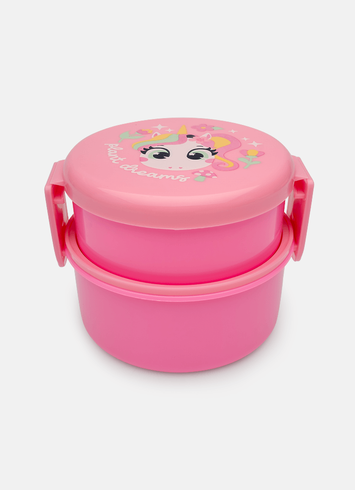 Marmita pequena em formato redondo com dois compartimentos, tampa de encaixe com estampa de Unicórnio floresta encantada. Acompanha 1 garfo de plástico