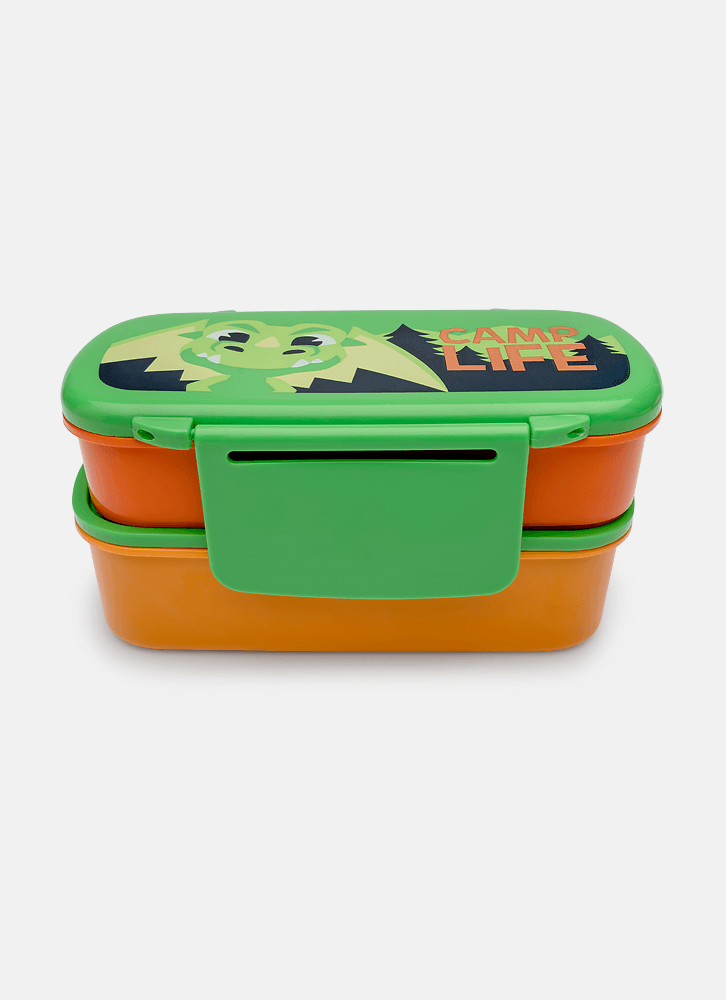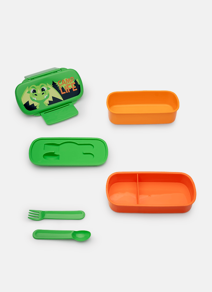 Marmita média em formato retangular de borda arredondada com dois compartimentos, tampa de encaixe com estampa de Dragão. Acompanha 1 garfo e 1 colher de plástico.