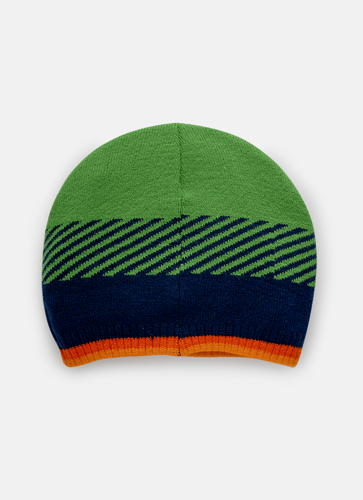 Gorro em tricô com padrão de listras e aplique frontal de Dragão.