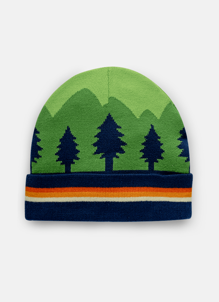 Gorro em tricô com padrão de montanhas e aplique bordado de patches de acampamento na barra.