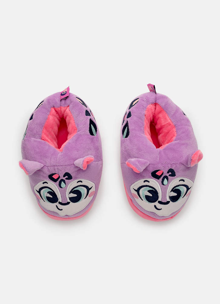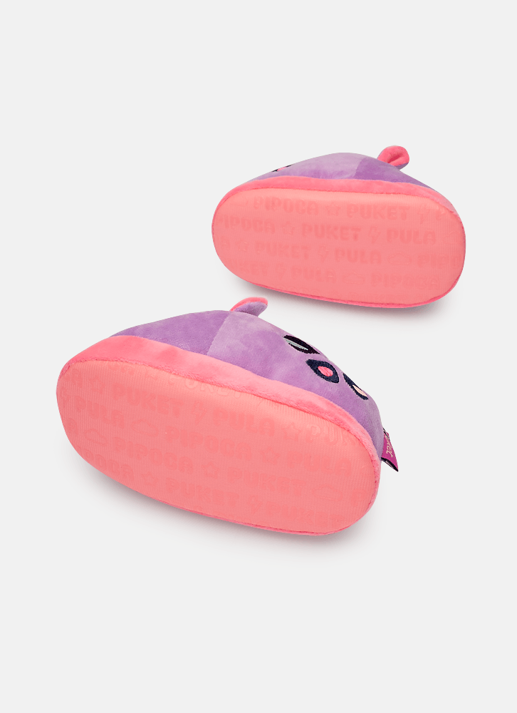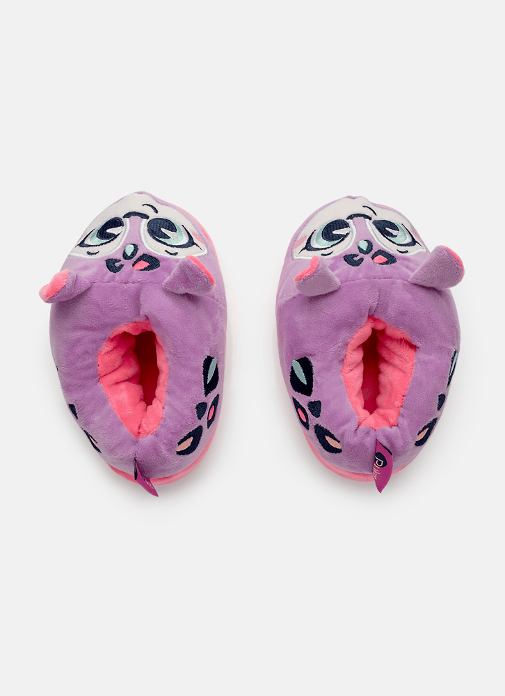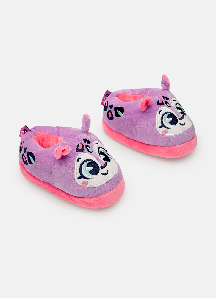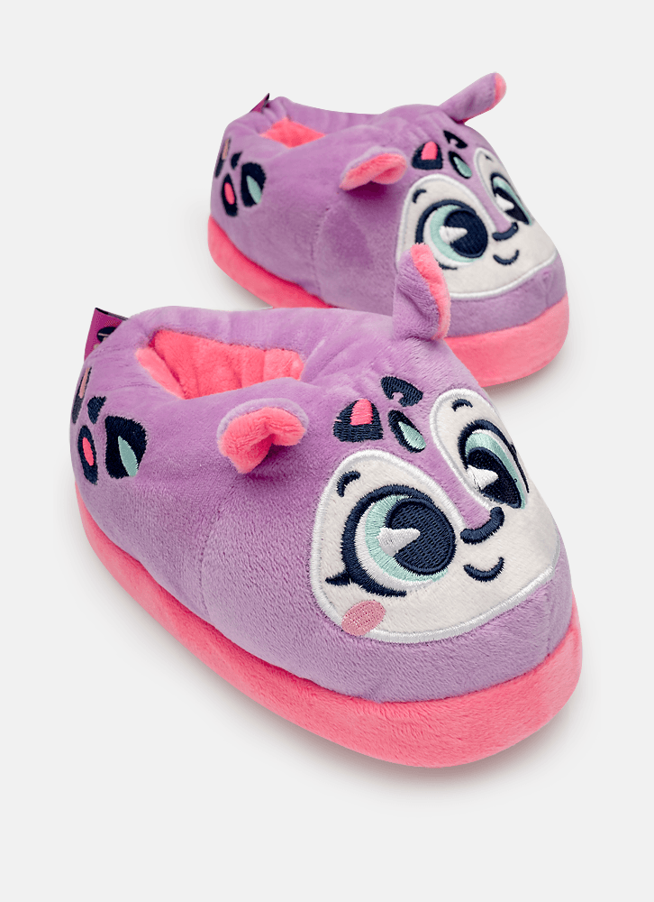 Pantufa Onça Fantástica infantil em pelúcia. Formato arredondado de onça com solado macio e confortável e forro em tecido macio.