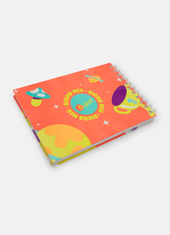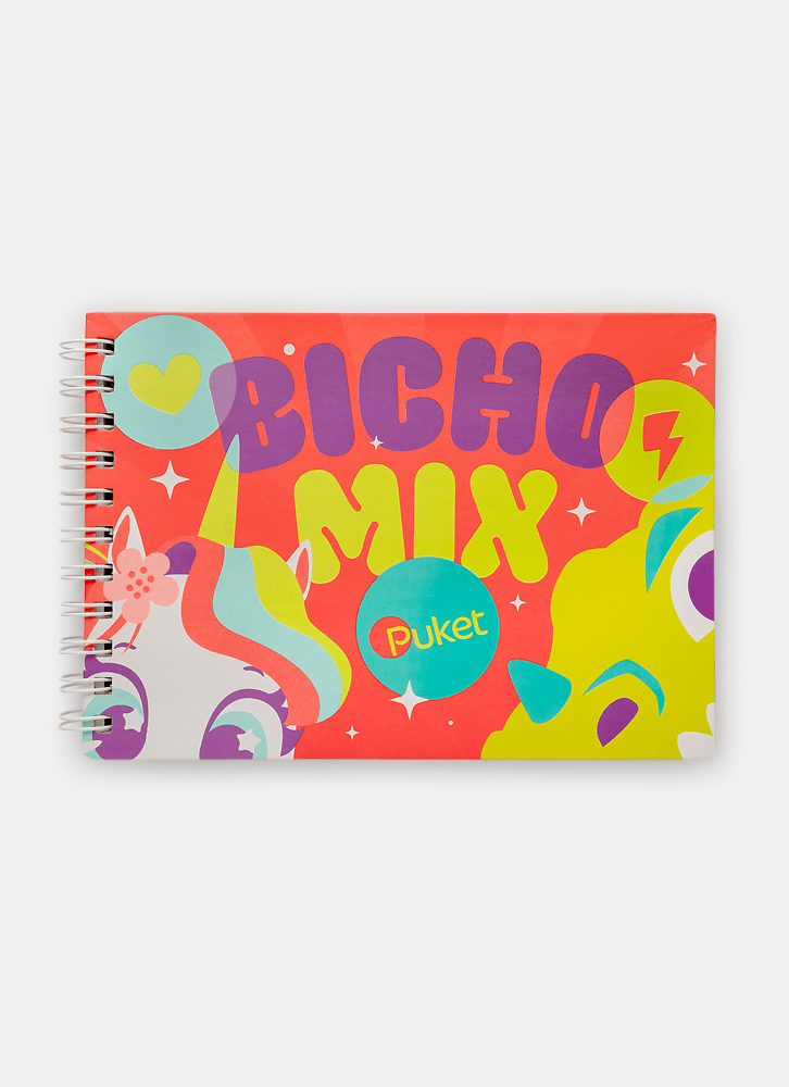 Livro de colorir no tema de Bicho Mix Puket. Possui capa dura e encardenação tipo wire-o.