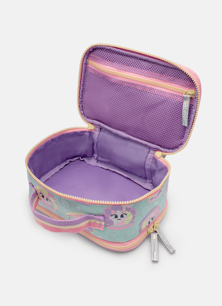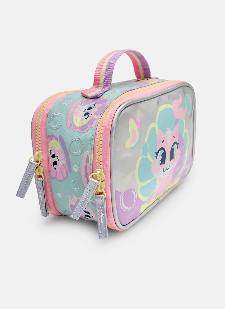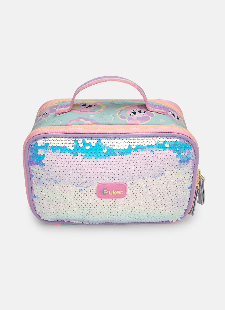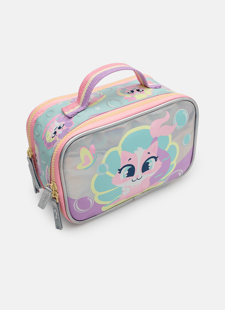 Estojo grande em nylon, parte frontal em PU fosco estampa localizada de Gata sereia, parte traseira com paetê reversível.