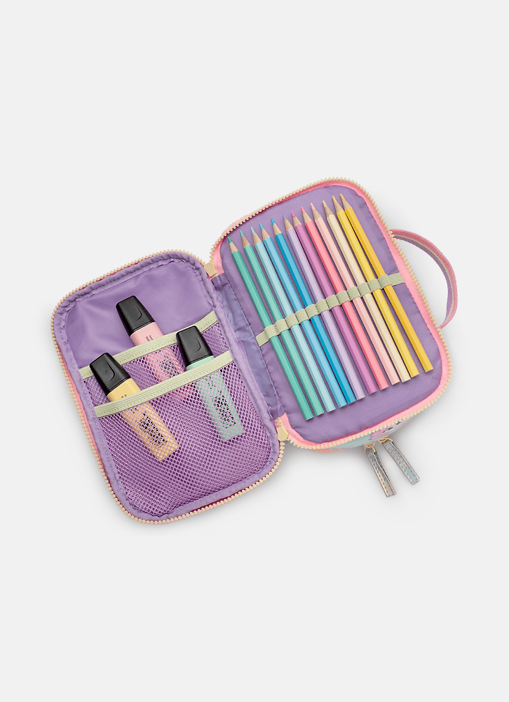 Possui aba interna com 24 elásticos para armazenamento de lápis.