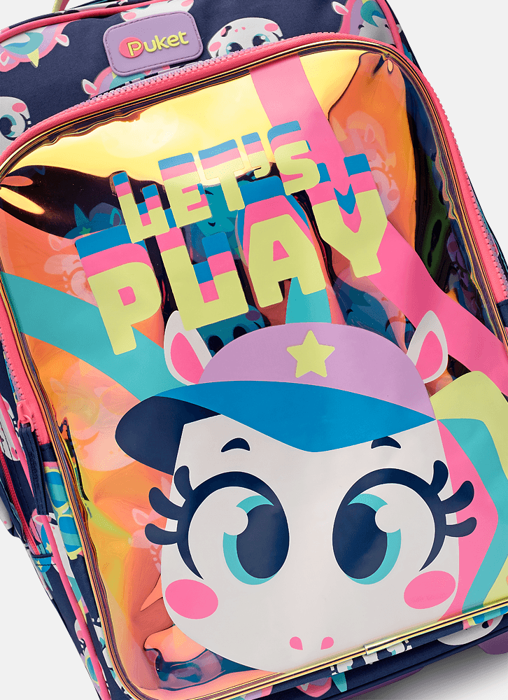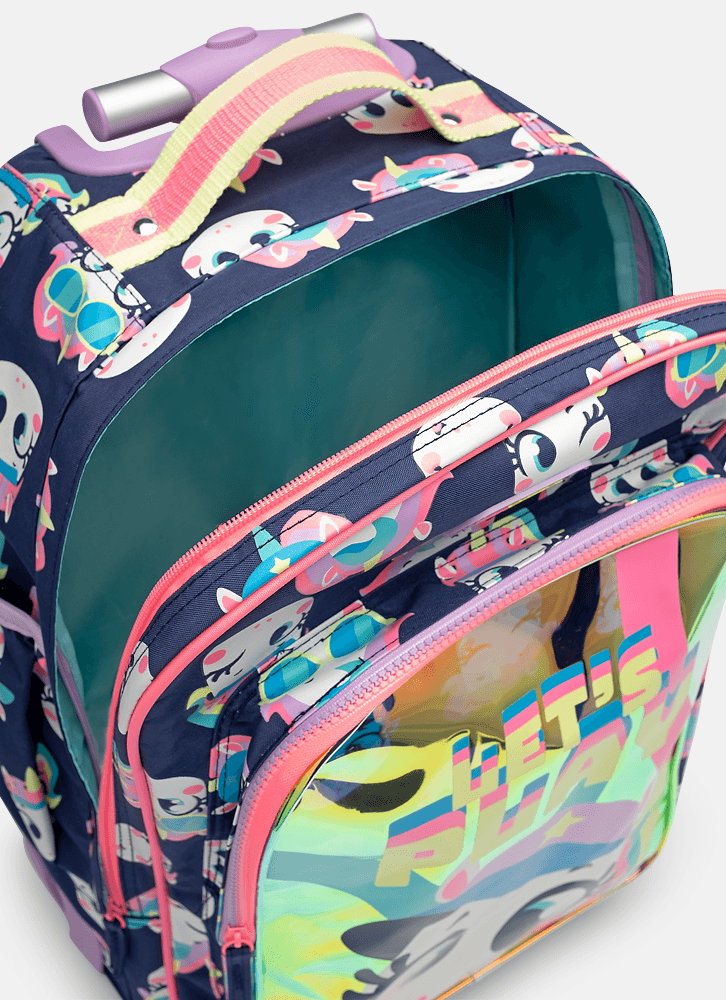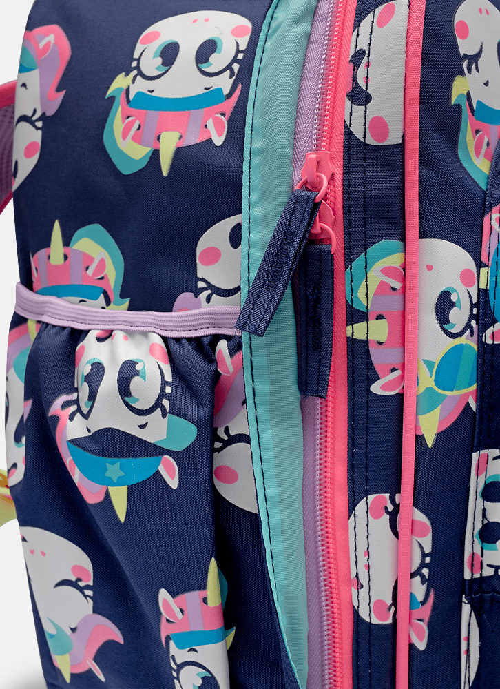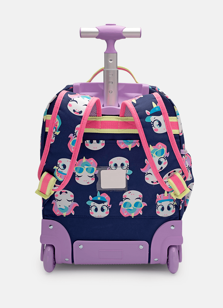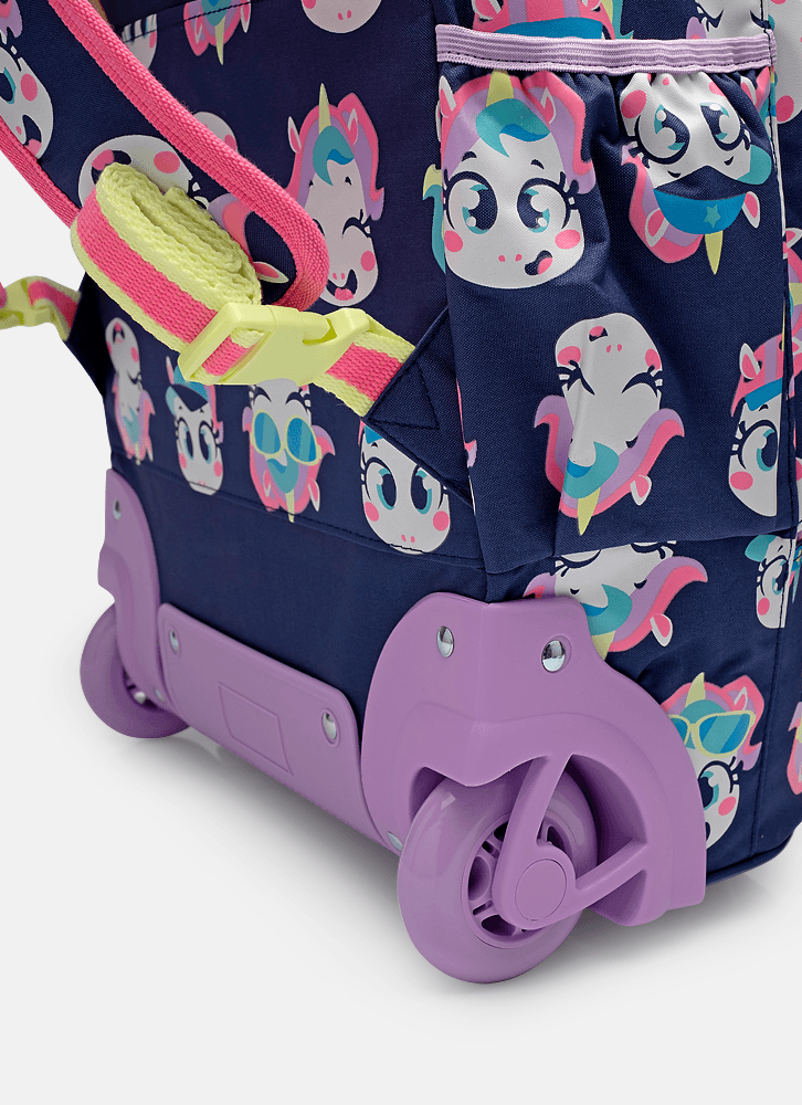 Mochila em nylon com rodinha e estampa corrida de unicórnio.