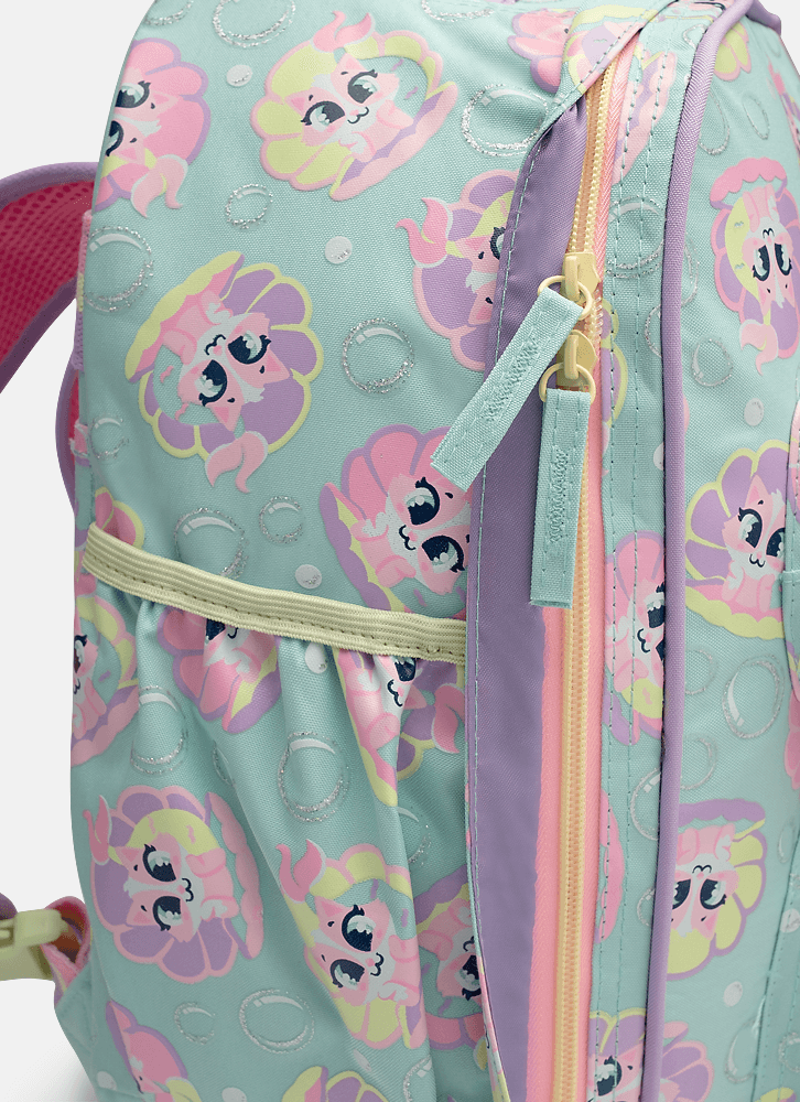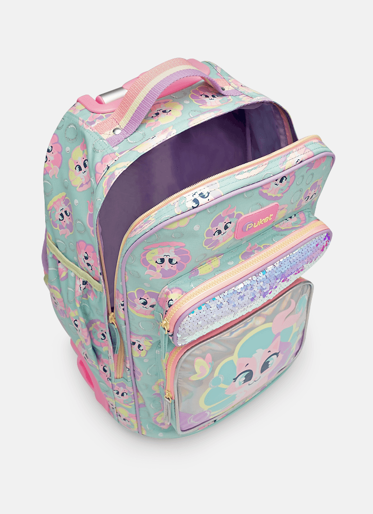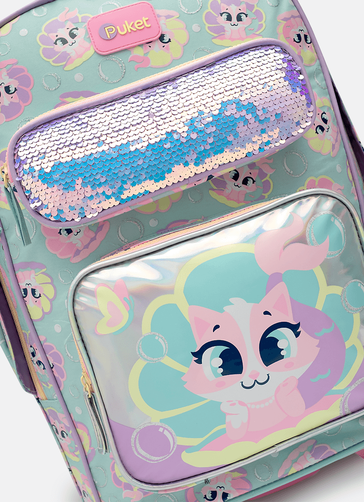 Leve a magia do fundo do mar para a sala de aula! A Mochila de Rodinha Grande da Gata Sereia foi criada para transformar o caminho para a escola em uma aventura encantadora. Com uma estampa superfofa de gatinhas sereia em um fundo verde-água, ela parece ter saído de um sonho. E o toque especial? Um bolso frontal com paetês. É impossível não se apaixonar!