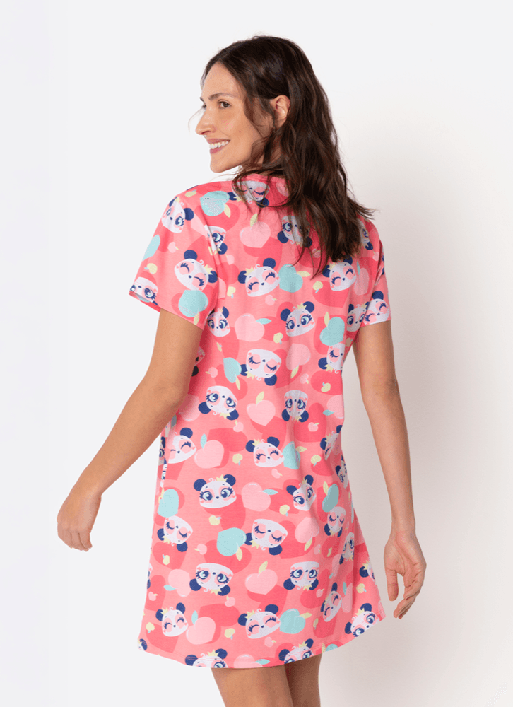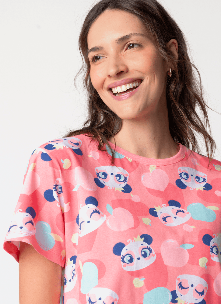 Camisola Manga Curta Algodão Feminina Panda Romântico
