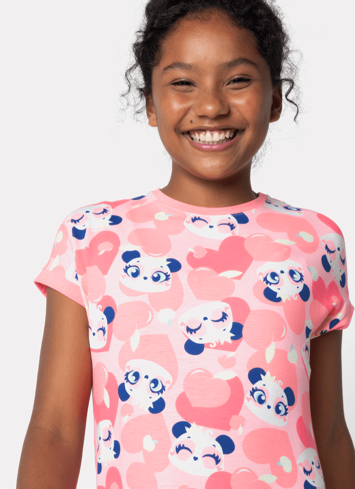 Camisola Manga Curta Viscolycra Menina Teen Panda Romântico