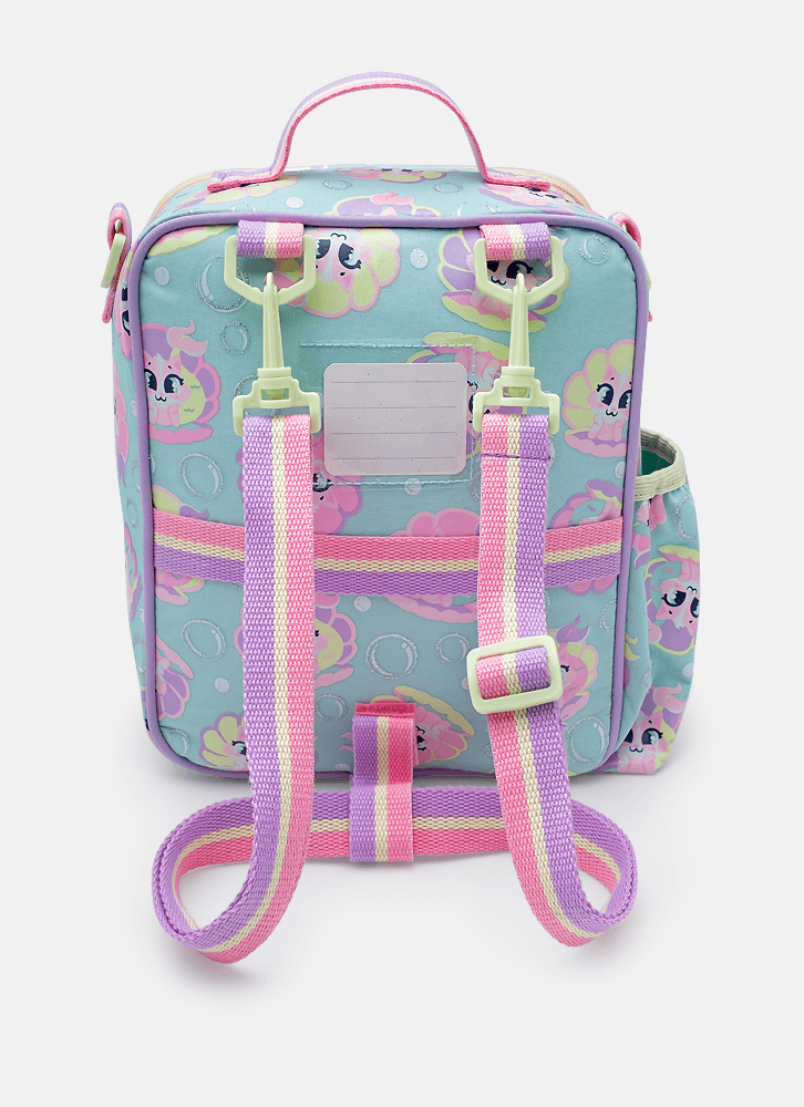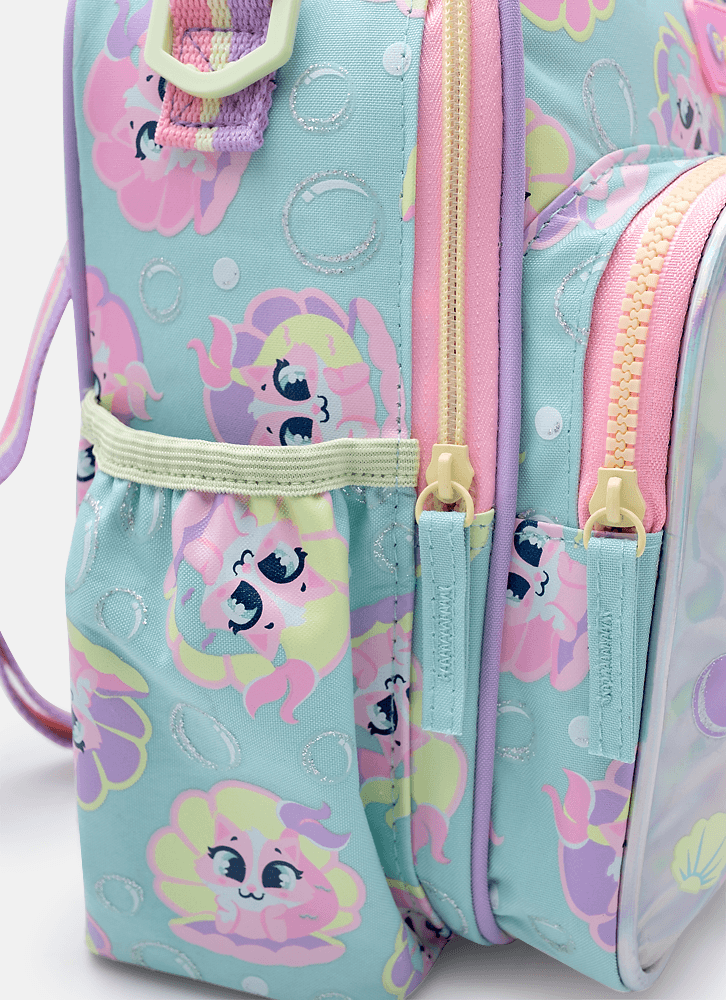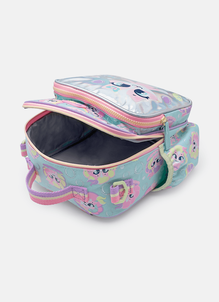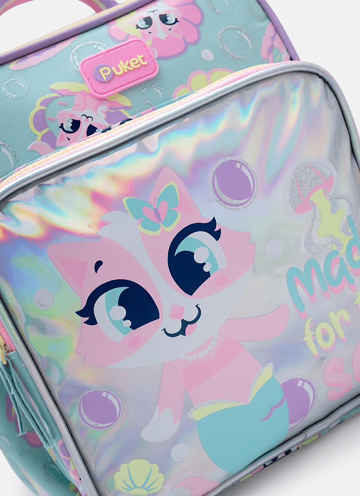 Lancheira em nylon, sem gel, com forro térmico e estampa corrida de Gata Sereia. Possui bolso frontal médio em TPU holográfico com estampa localizada de Gata Sereia. Alça de mão fixa e alça de ombro com regulagem.