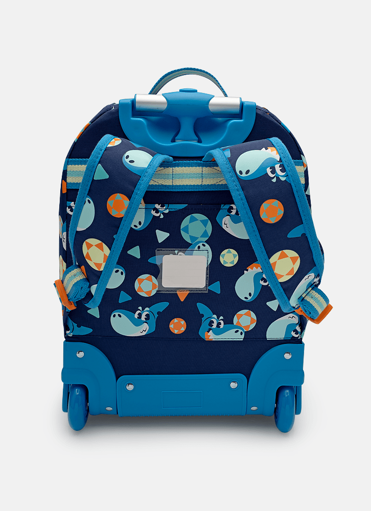 Mochila em nylon com rodinha e estampa corrida de Tubarão. Bolso frontal médio em PVC transparente, bolsinho lateral pra garrrafinha, alça de mão e puxador com duas alturas de regulagem.