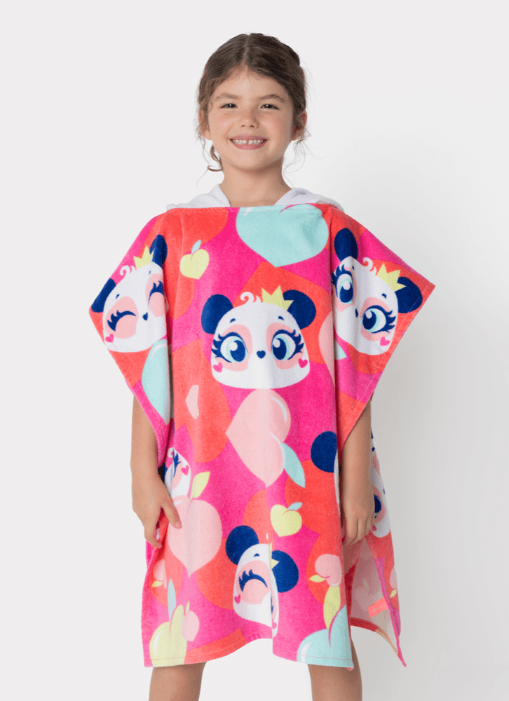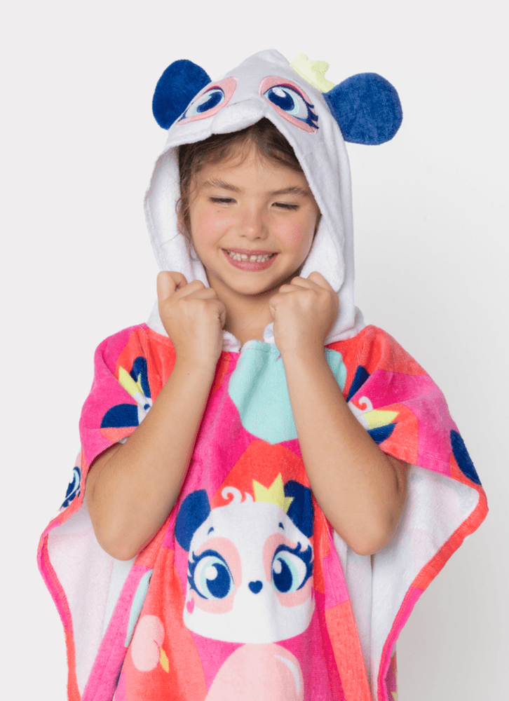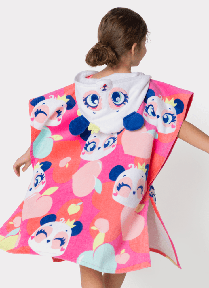 Poncho atoalhado com estampa divertida em ambos os lados. Ideal para os momentos pós banho, piscina, praia e brincadeiras com água. Possui capuz bordado com apliques em 3D.