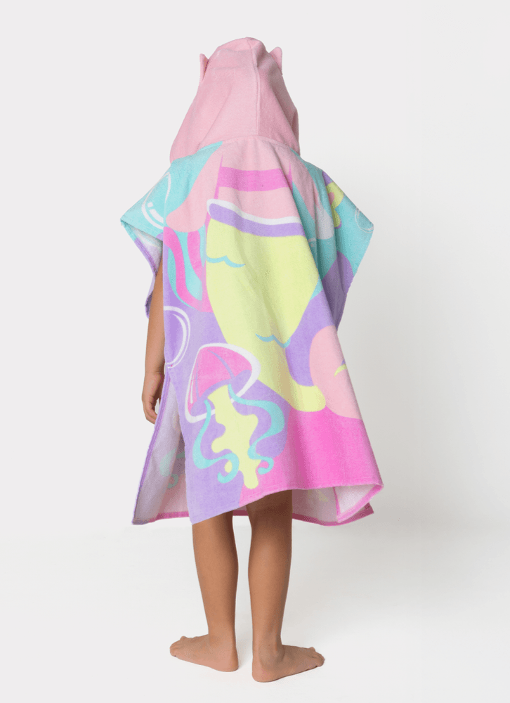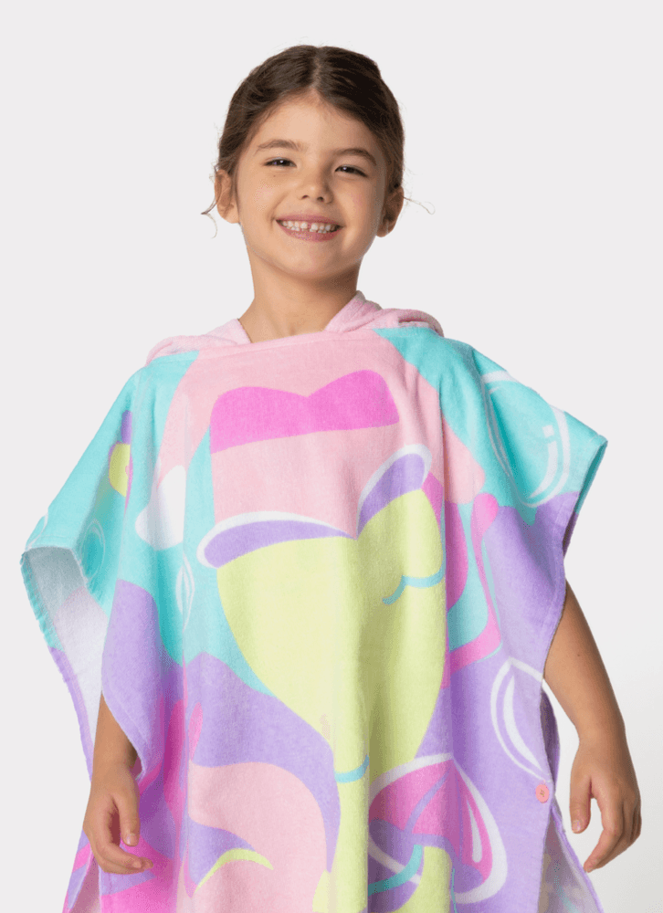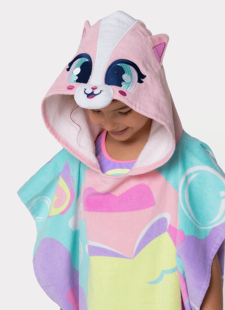 Poncho atoalhado com estampa divertida em ambos os lados. Ideal para os momentos pós banho, piscina, praia e brincadeiras com água. Possui capuz bordado com apliques em 3D.