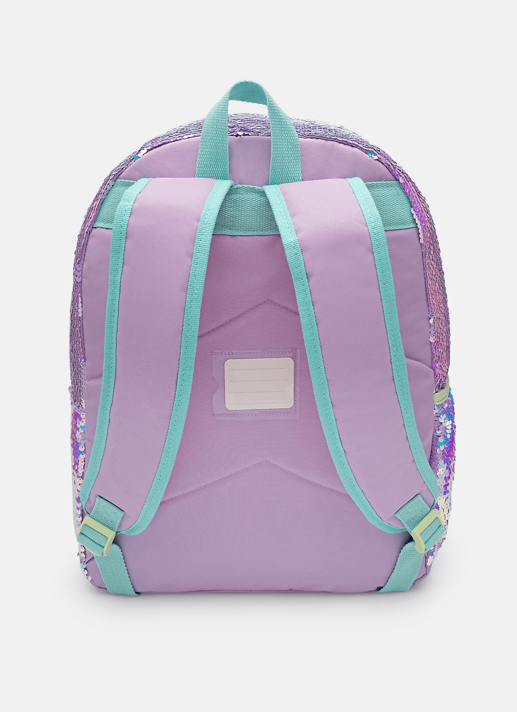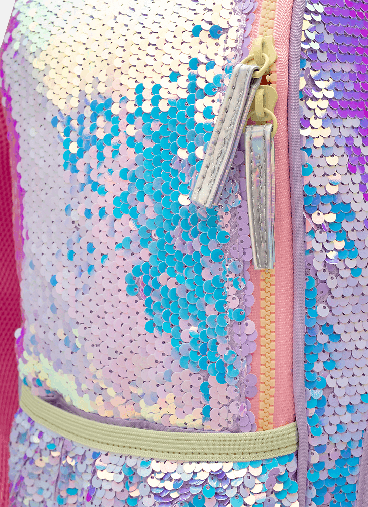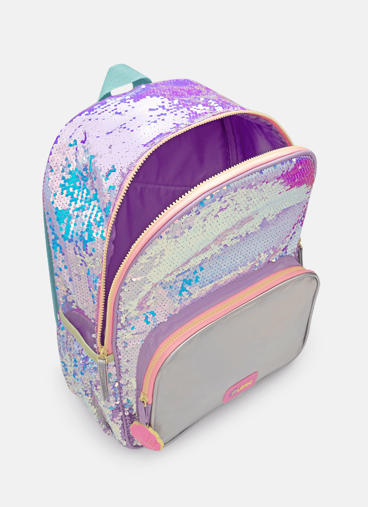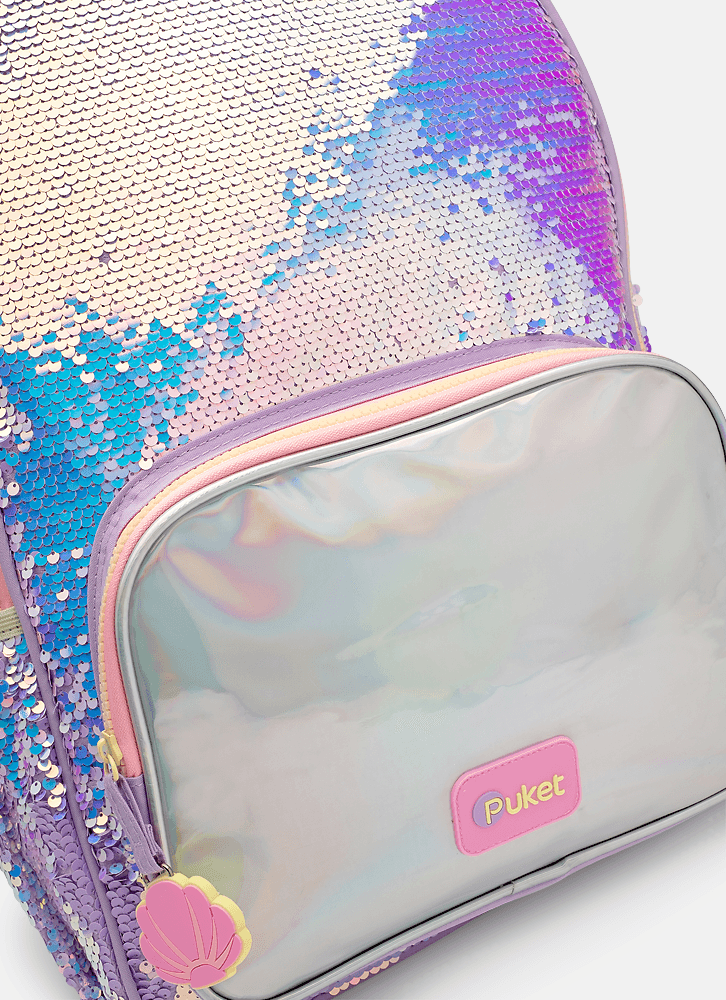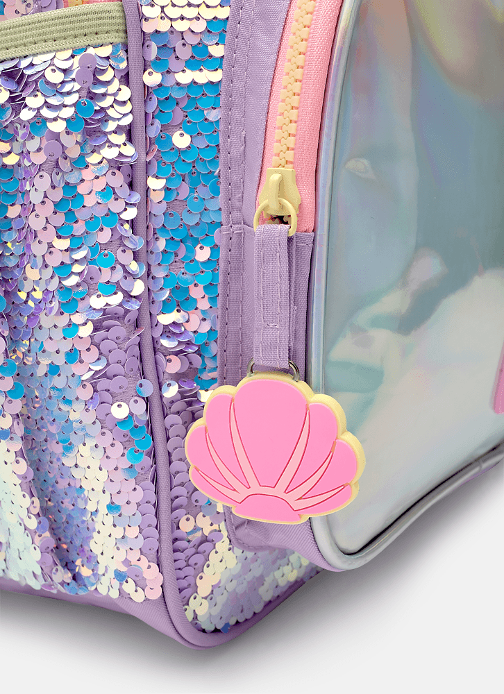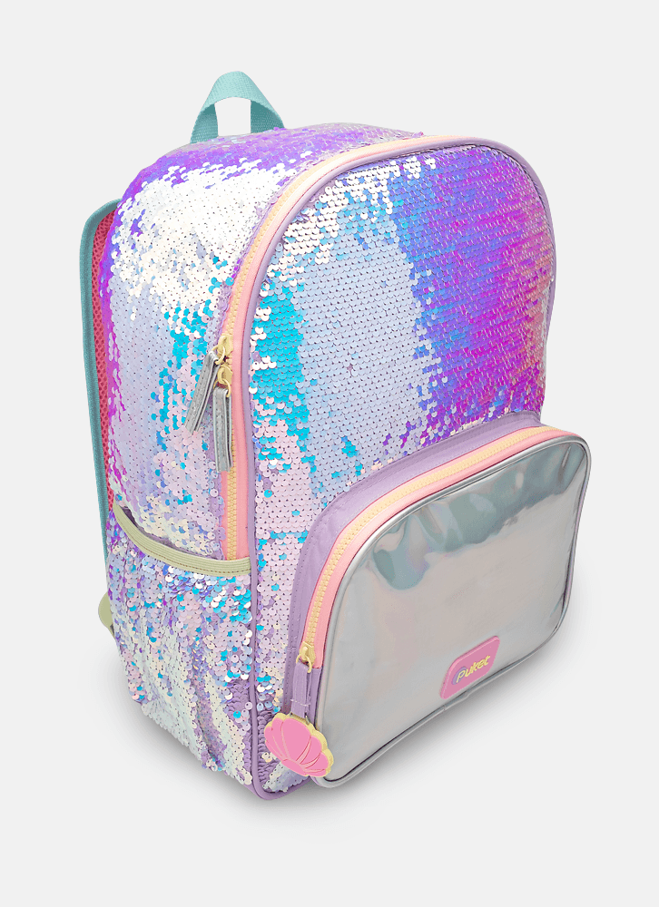Mochila de paête reversível com bolso frontal médio em TPU holografico. Possui 1 bolsinho lateral para garrafinha. Alça de mão e alça de costas com regulagem de altura.
