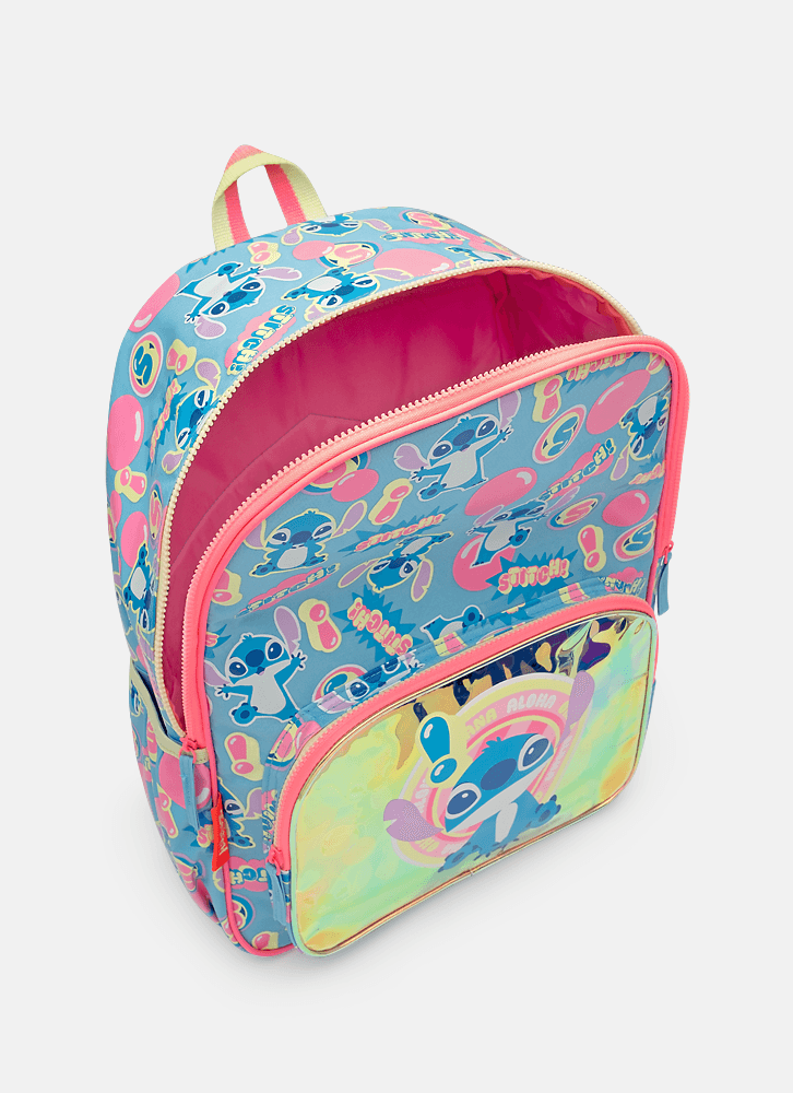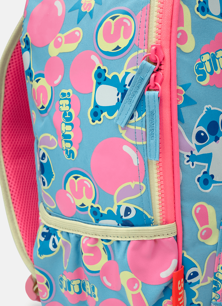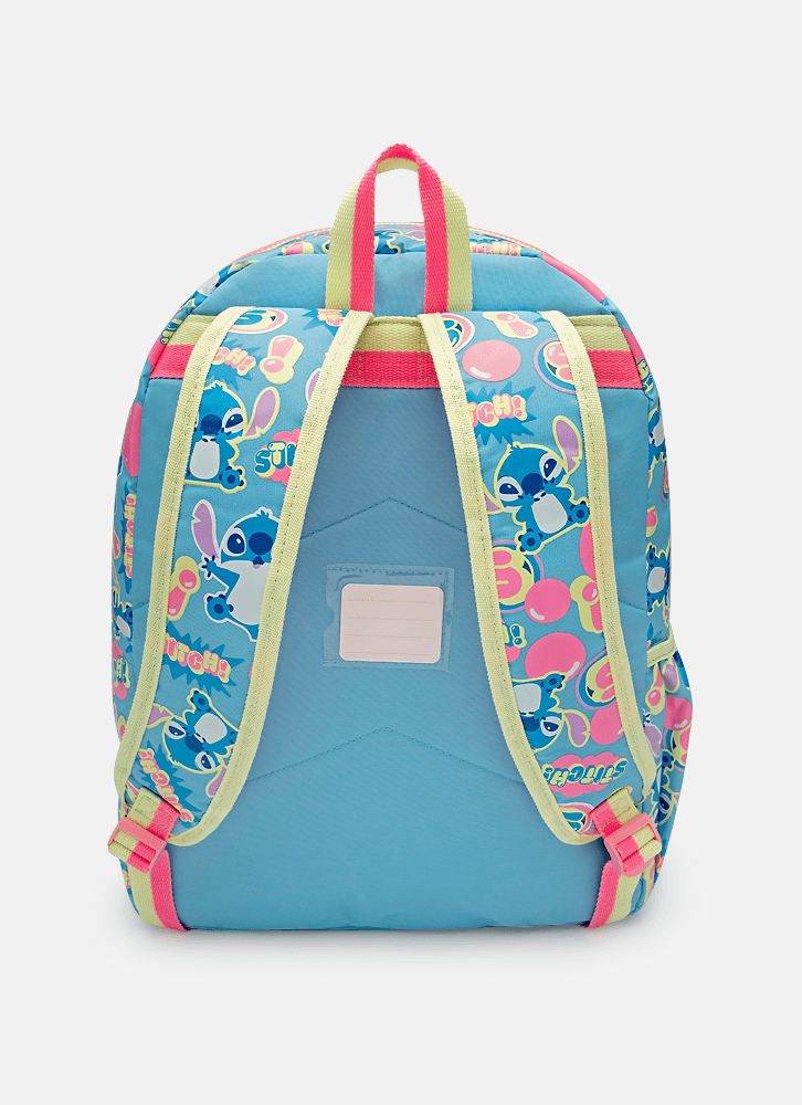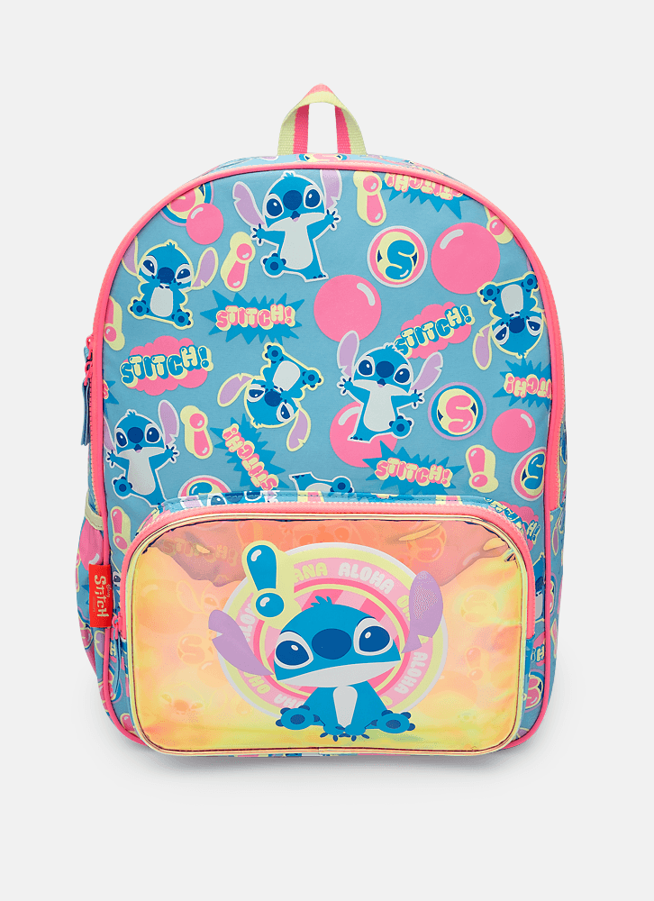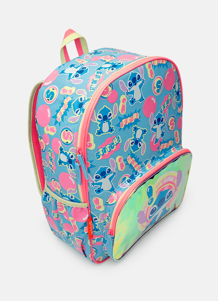 Mochila grande em nylon com bolso frontal em TPU holográfico com estampa localizada do Stitch. Possui fechamento por zíper e bolsinho lateral para garrafinha.
