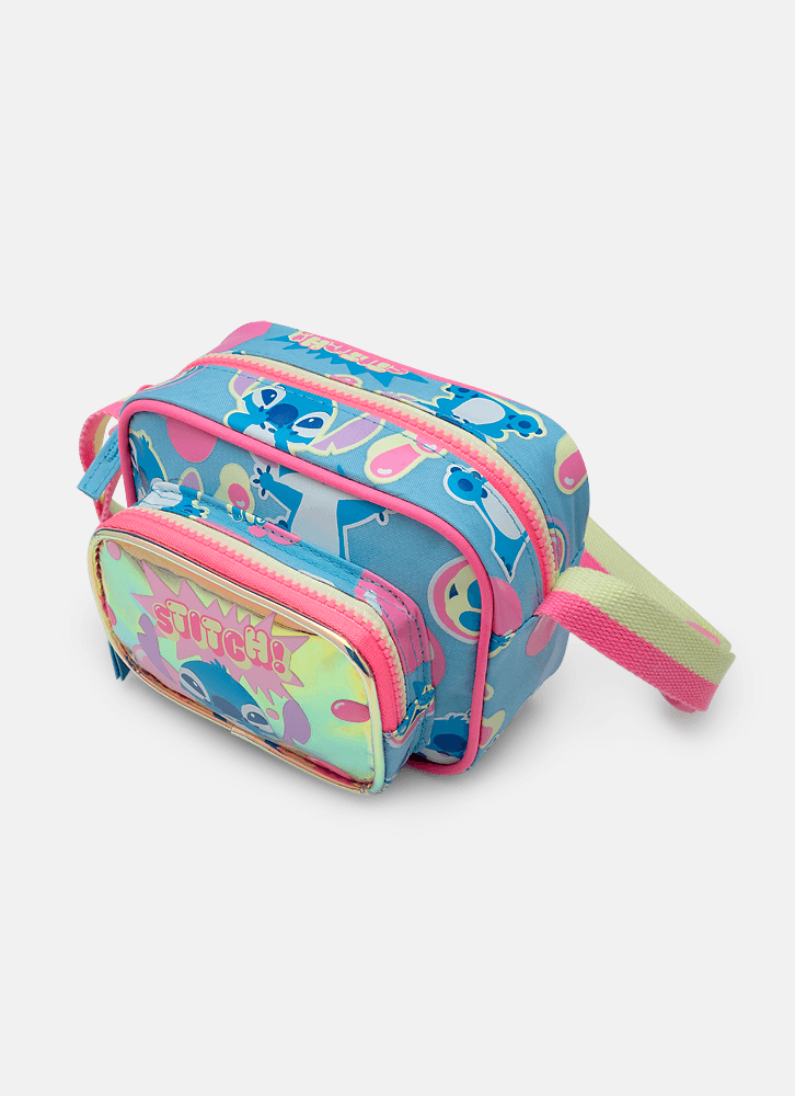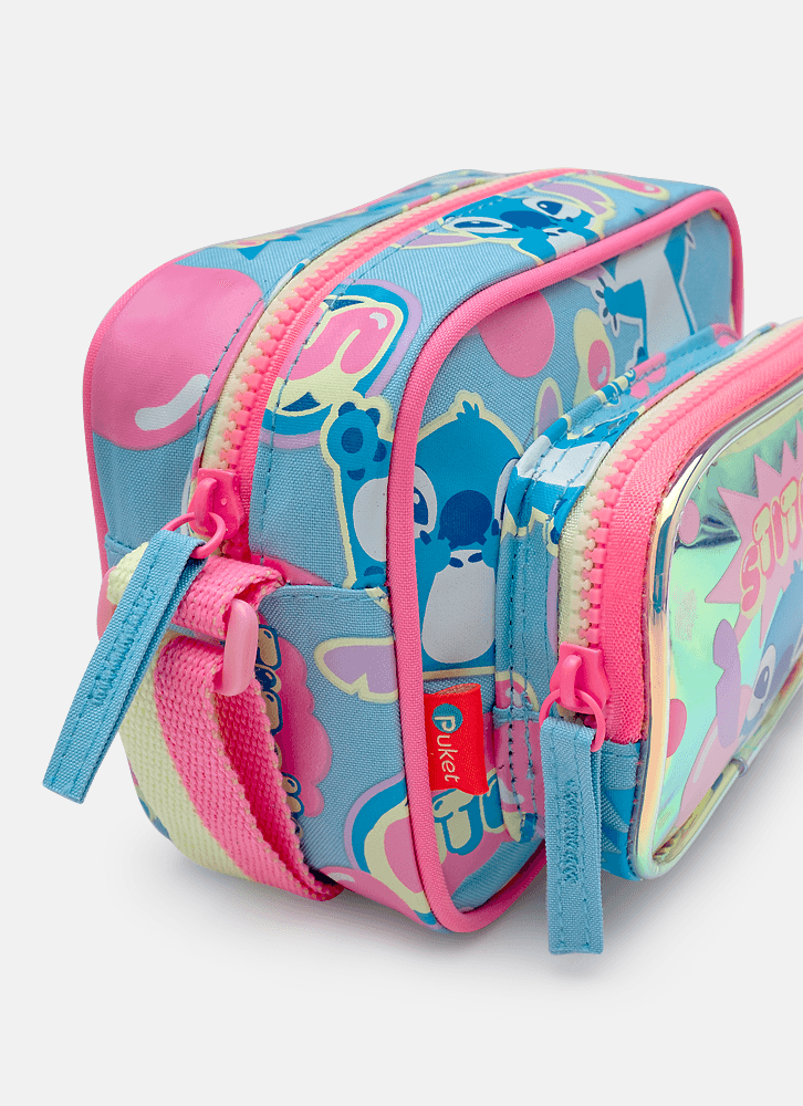 Bolsinha com bolso frontal em TPU holográfico com estampa do Stitch. Possui alça regulável.