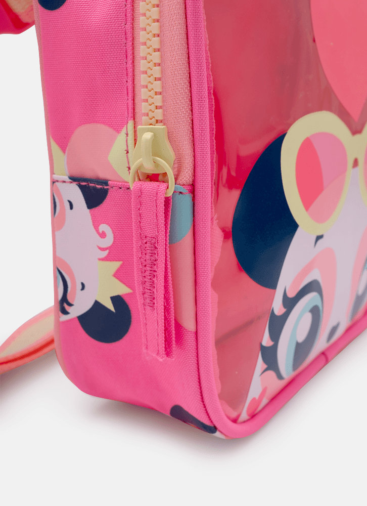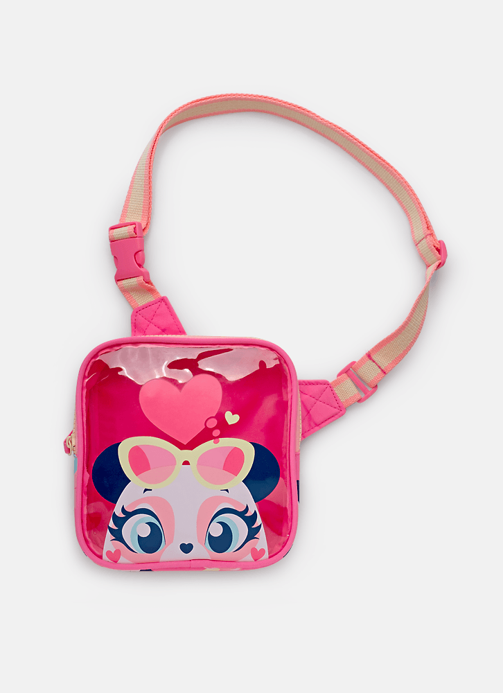 Bolsinha com frontal em PVC transparente com estampa de panda. Possui alça regulável.