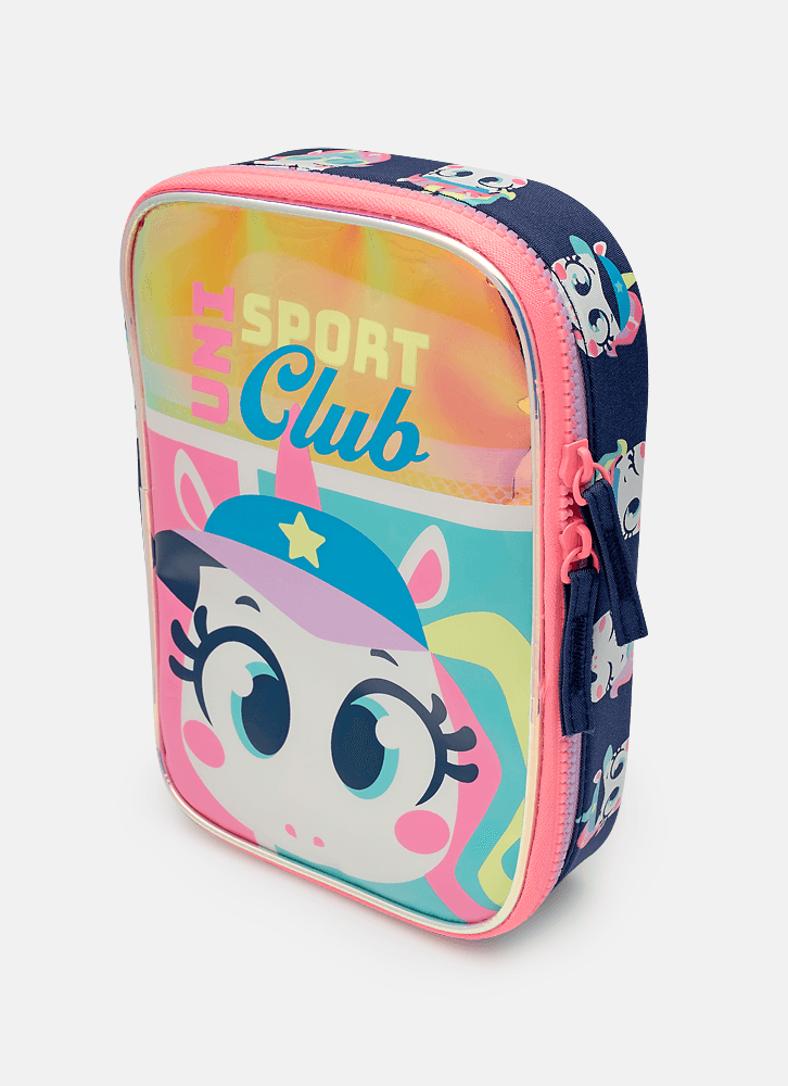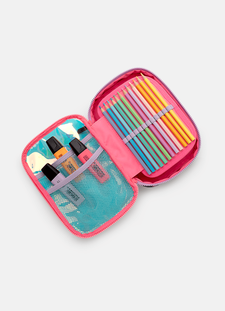 Estojo grande em nylon. Parte frontal em TPU holográfico com estampa de unicórnio. Possui aba interna com 24 elásticos para armazenamento de lápis.