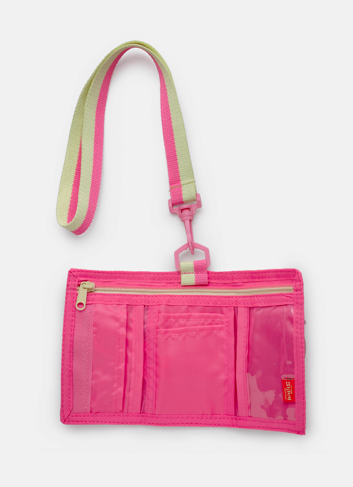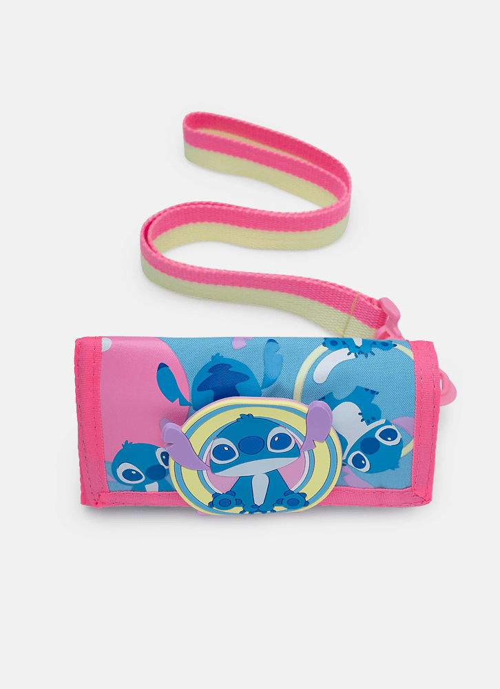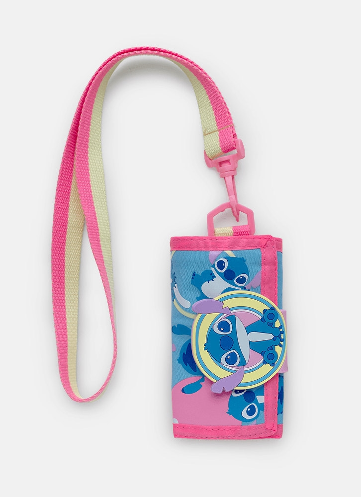 Carteira em nylon com estampa de Stitch e alça de pescoço. Possui aplique emborrachado para fechamento e bolso interno com fechamento em zíper.