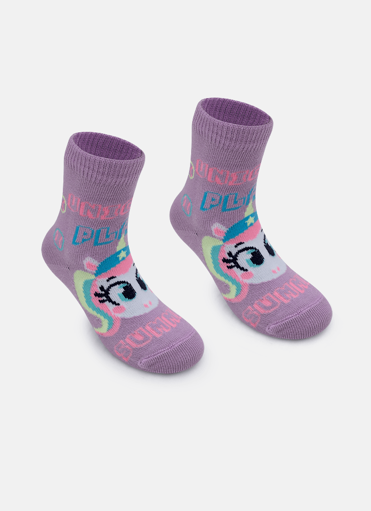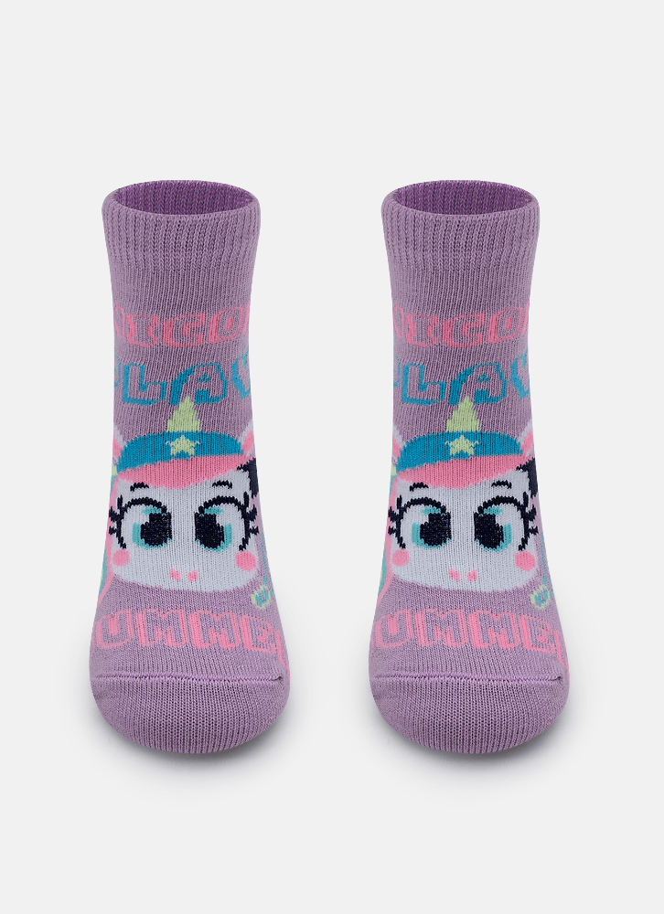 Meia soquete com desenho divertido de unicórnio. Possui cano de altura média. Produzida com algodão macio em sua maior parte, e poliamida no desenho. Indicação de uso: Ideal para usar com calçados fechados. Instruções de Lavagem: Lavagem a mão Não alvejar Instruções de Conservação: Não secar em tambor Não passar Não limpar a seco (MAIS INFORMAÇÕES, VIDE NA ETIQUETA) Instruções de Garantia: Deverá ser encaminhado dentro na embalagem original, sem indicações de uso ACOMPANHADO DE NOTA FISCAL E com todos os itens constante na solicitação da compra.