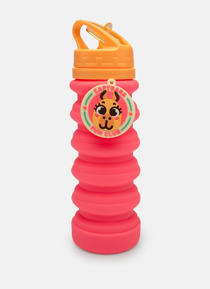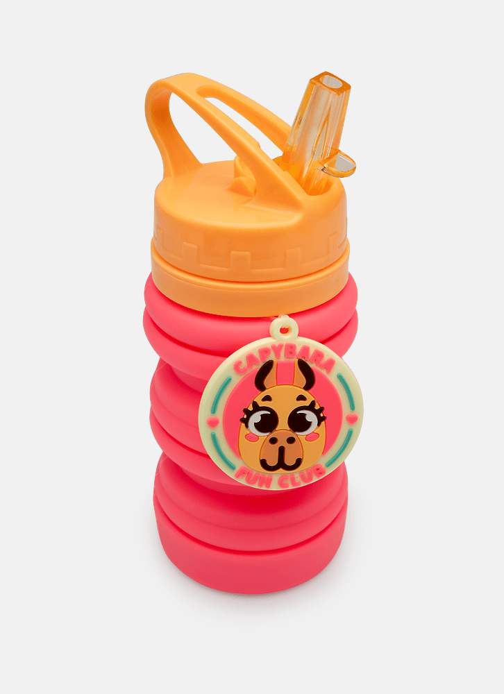 Garrafinha em silicone. Possui forma retrátil (menor quando vazia), tampa de rosquear com bico embutido e aplique emborrachado de Capivara.