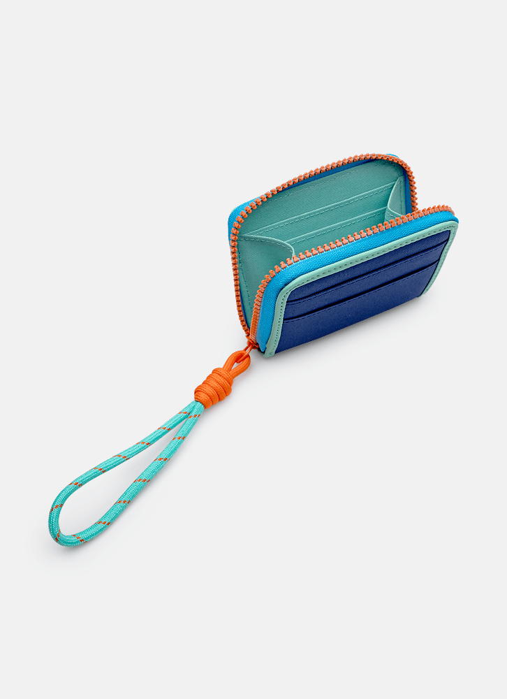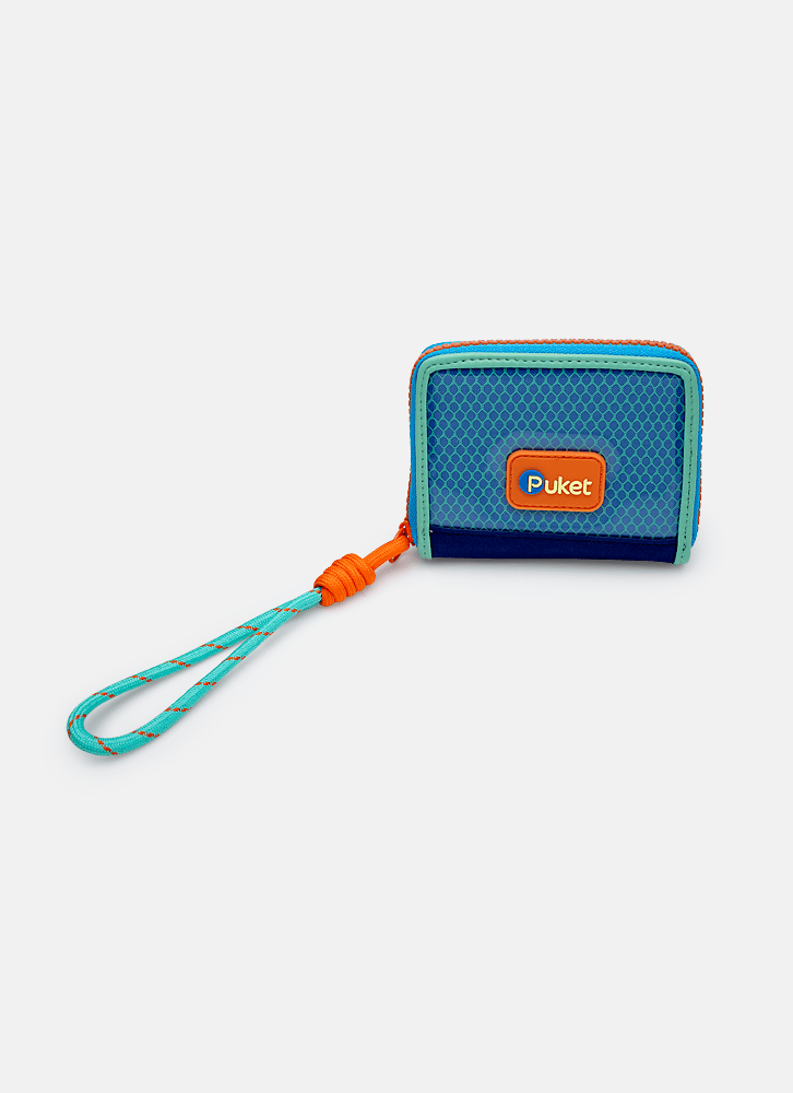 Carteira em nylon Color Block. Detalhe de PVC telado. Possui e alça de mão e bolso interno com fechamento em zíper.