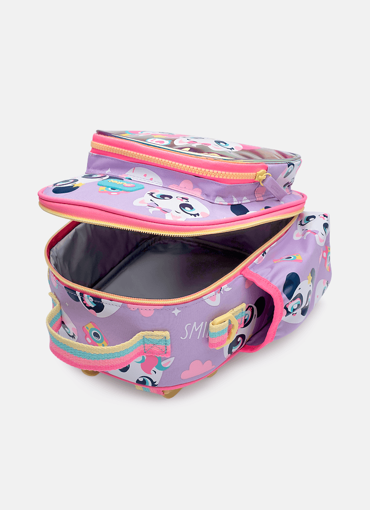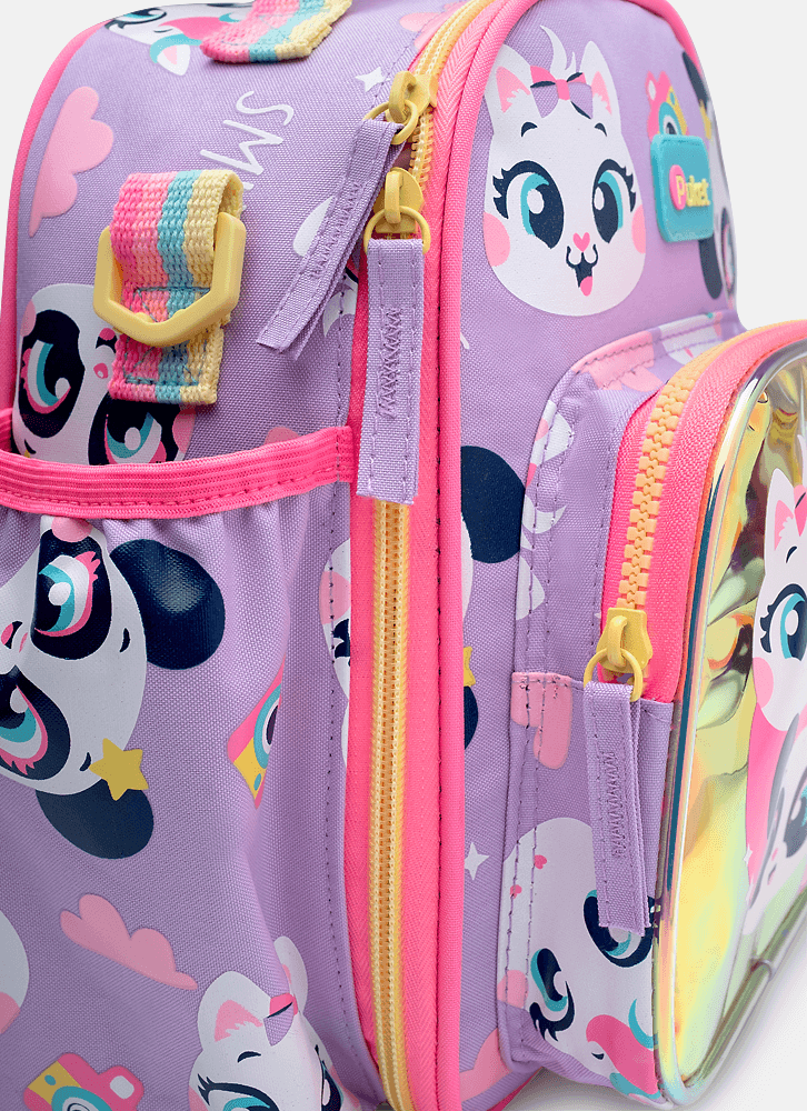 Lancheira em nylon, sem gel, com forro térmico. Possui bolso frontal médio em TPU holográfico com estampa de multibichos.