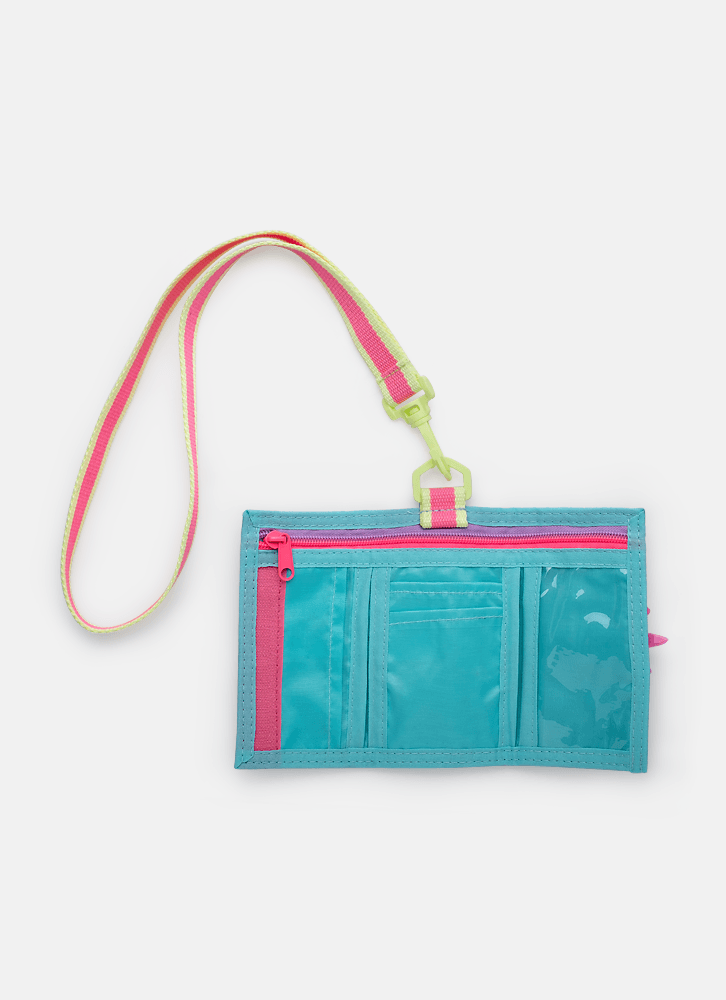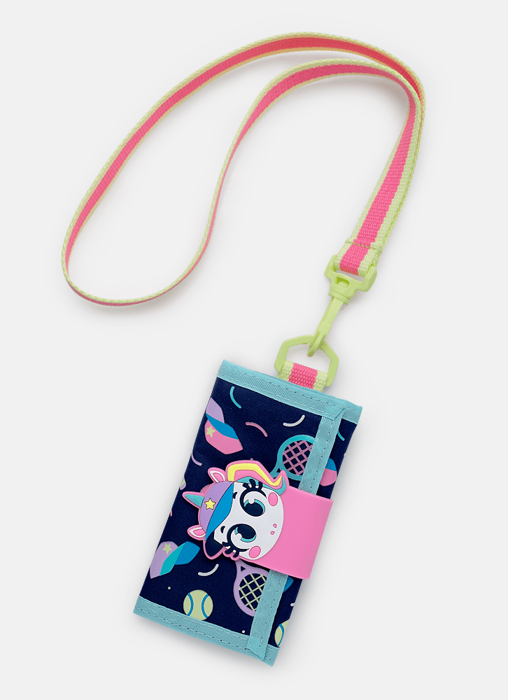 Carteira em nylon com estampa de Unicórnio e alça de pescoço. Possui aplique emborrachado para fechamento e bolso interno com fechamento em zíper.